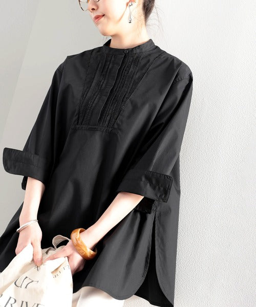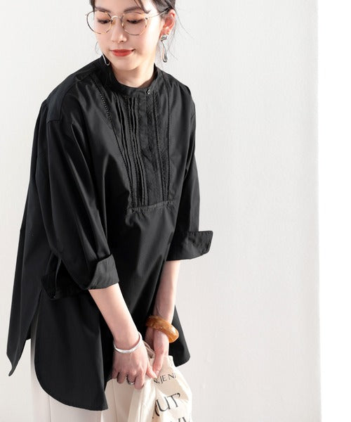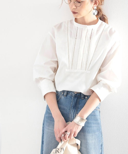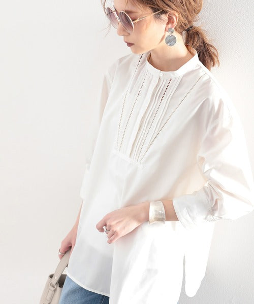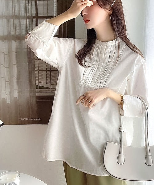 フロントにピンタックとはしごレースの切り替えデザインで、