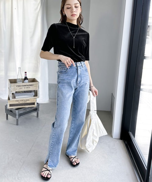 ドレッシーなベロア素材感を程よくカジュアルダウン。