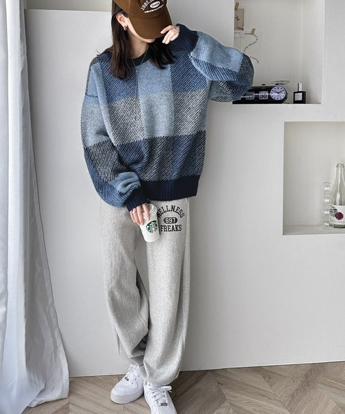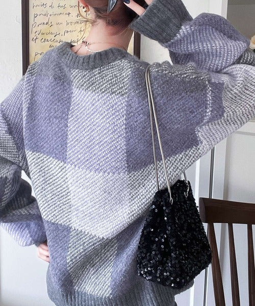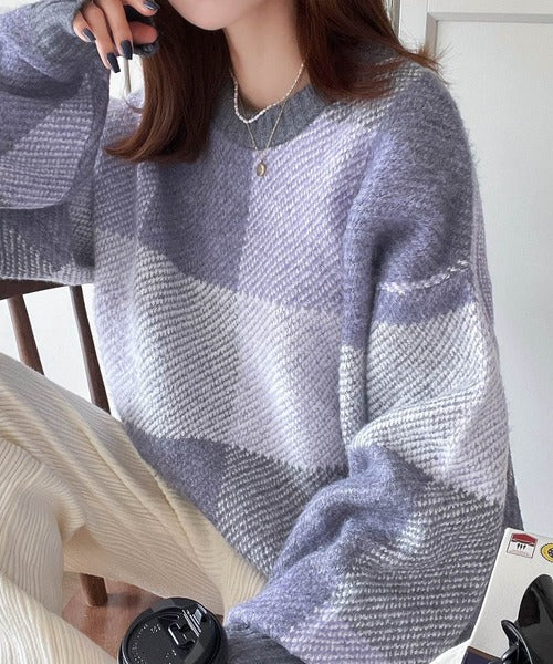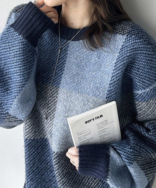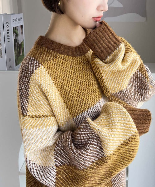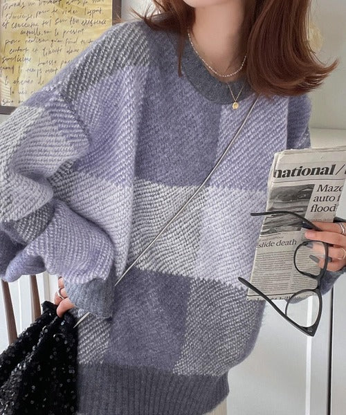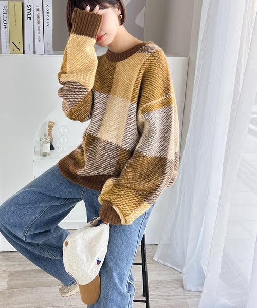 もっちり暖かい。配色ブロックチェックニット ce1020126