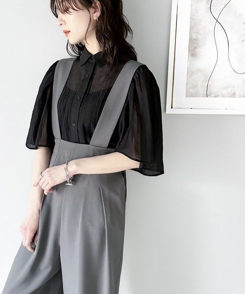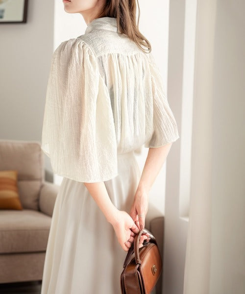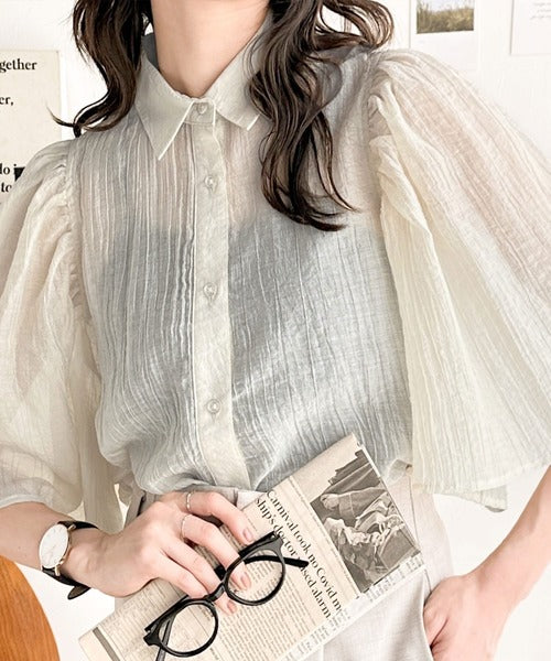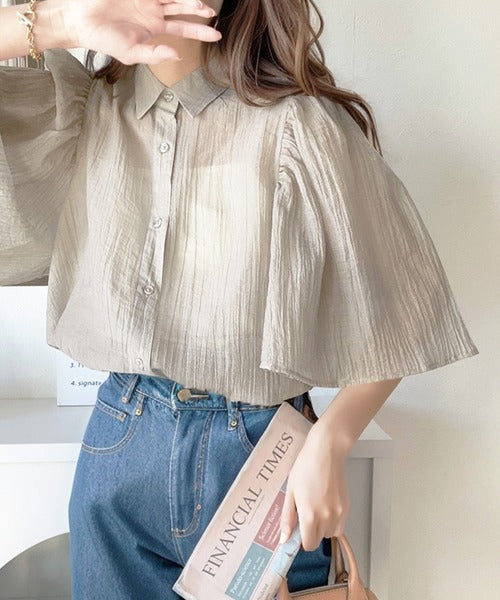 涼しげお洒落なフェミニンスタイル。ふんわり楊柳ボリュームフレアスリーブシャツ ce1020136