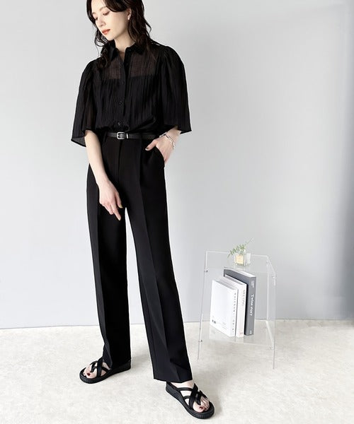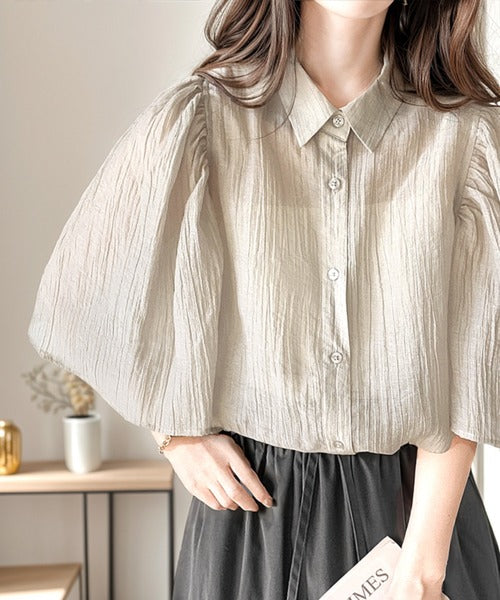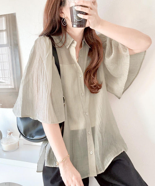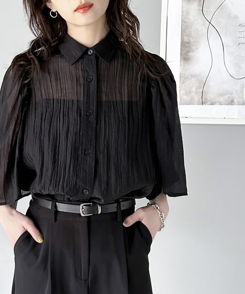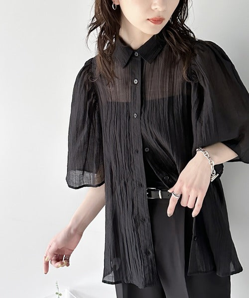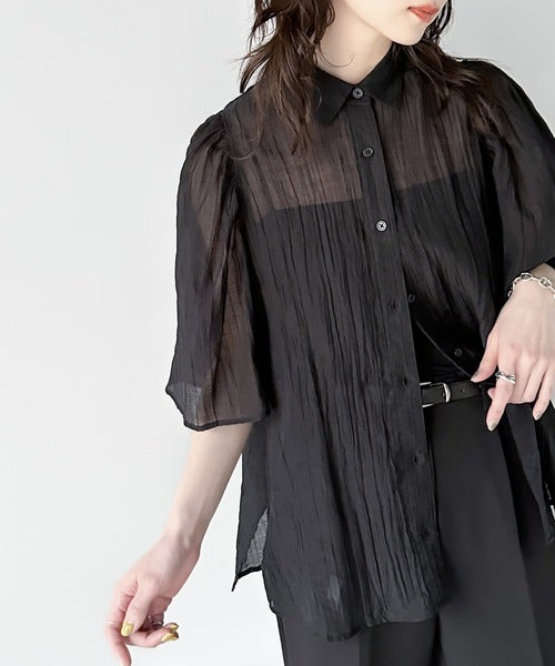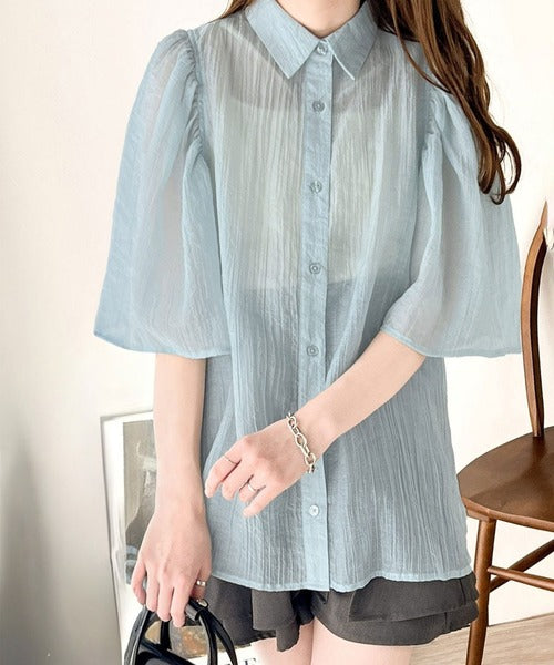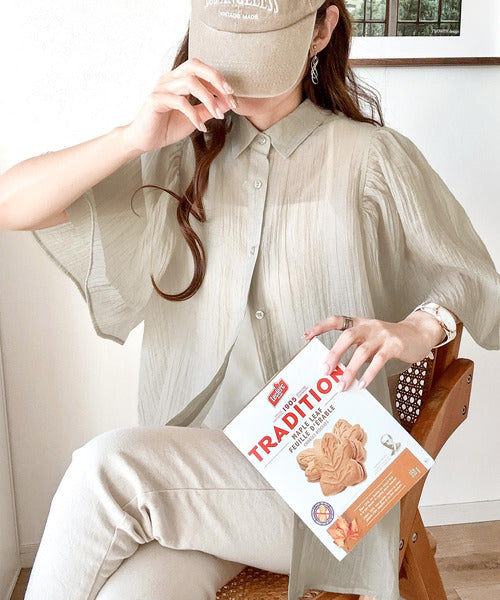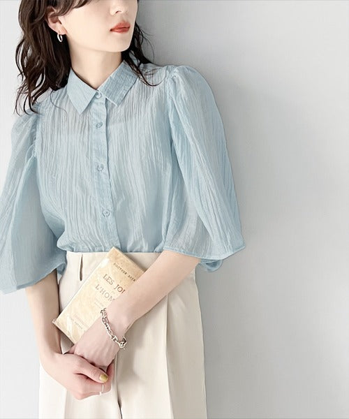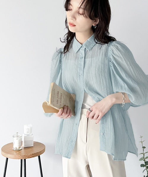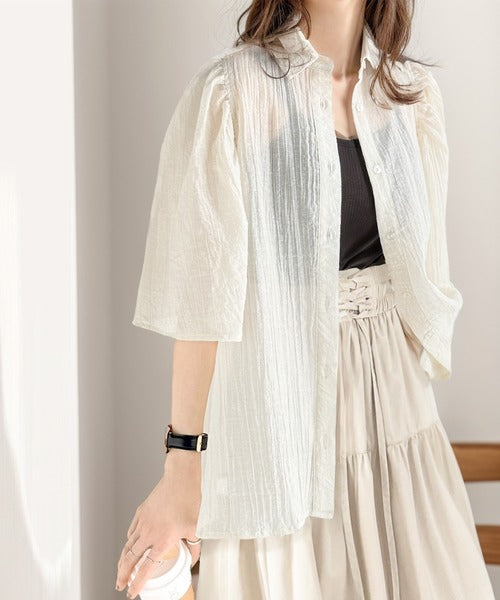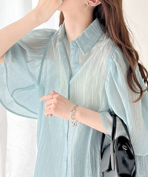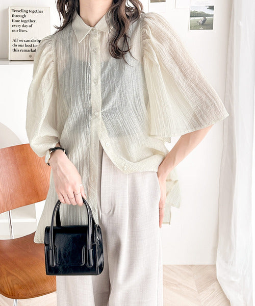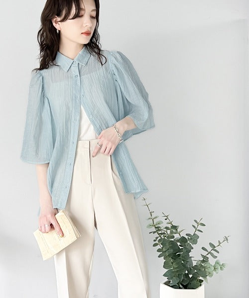 透け感があるシアー楊柳素材で、涼し気な印象のガーリールックシャツ。