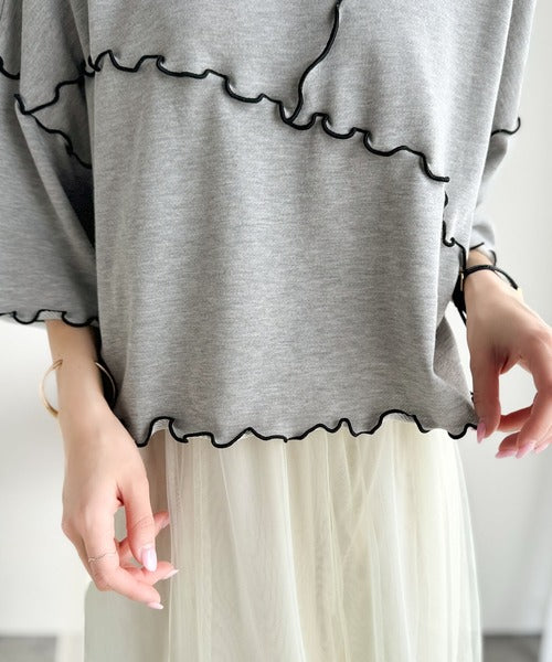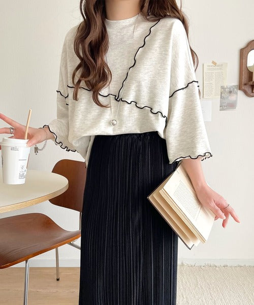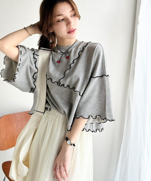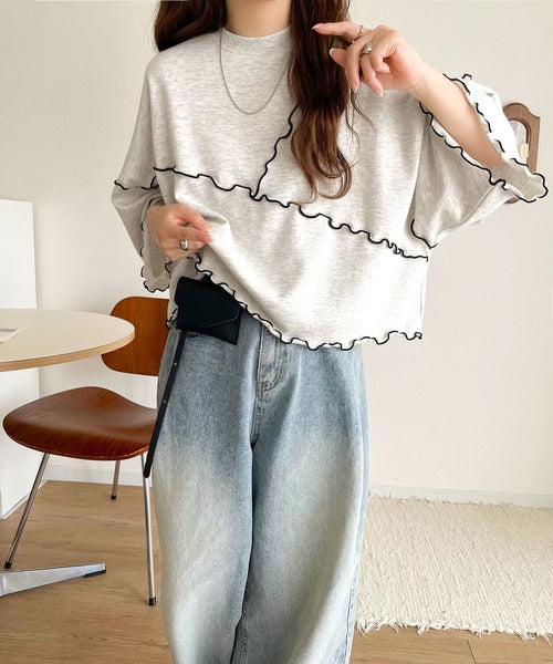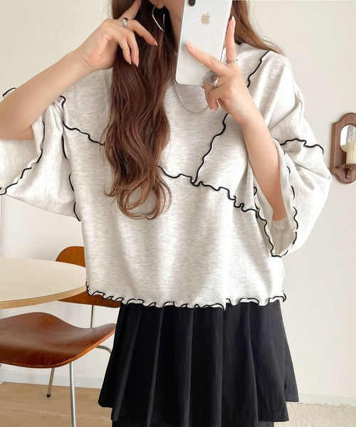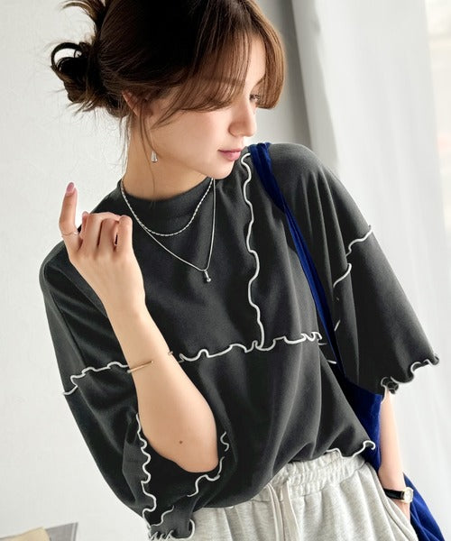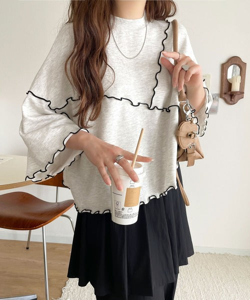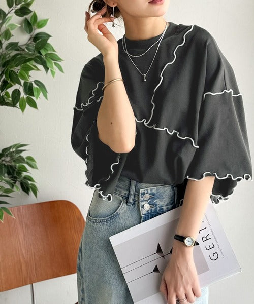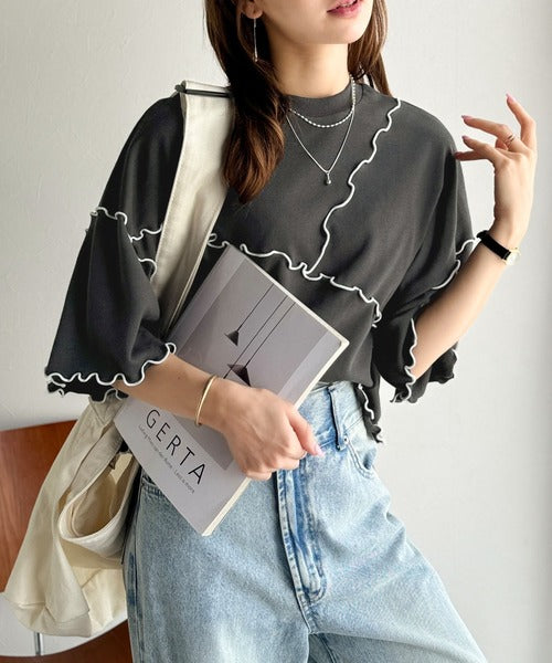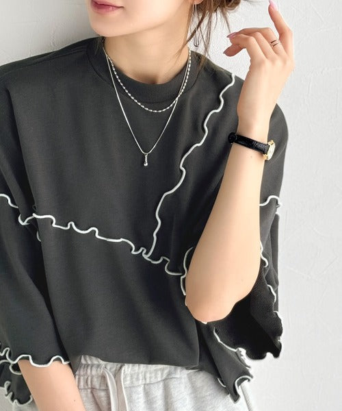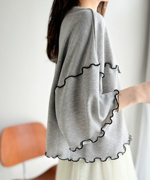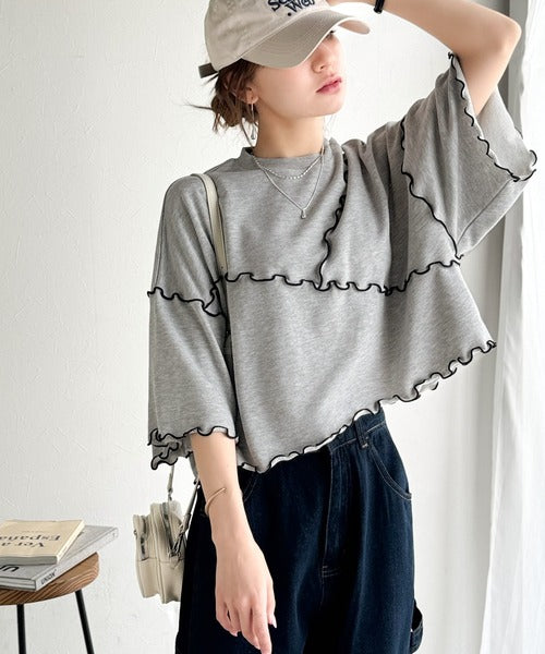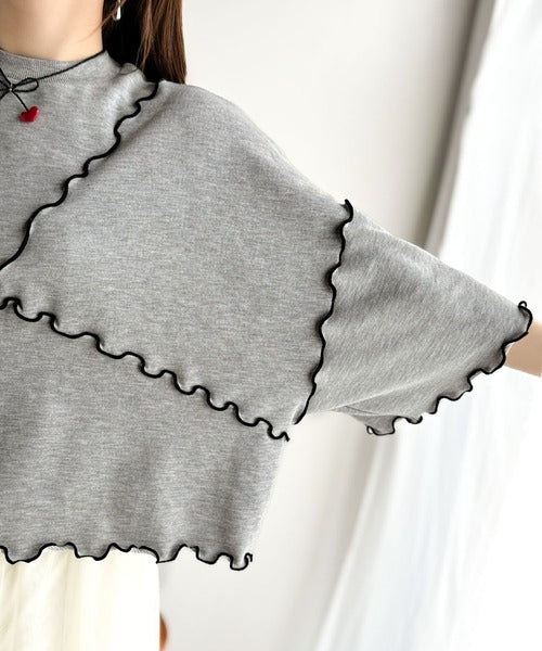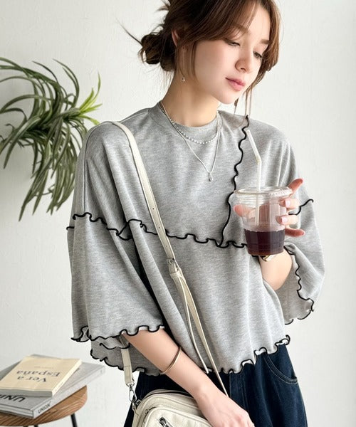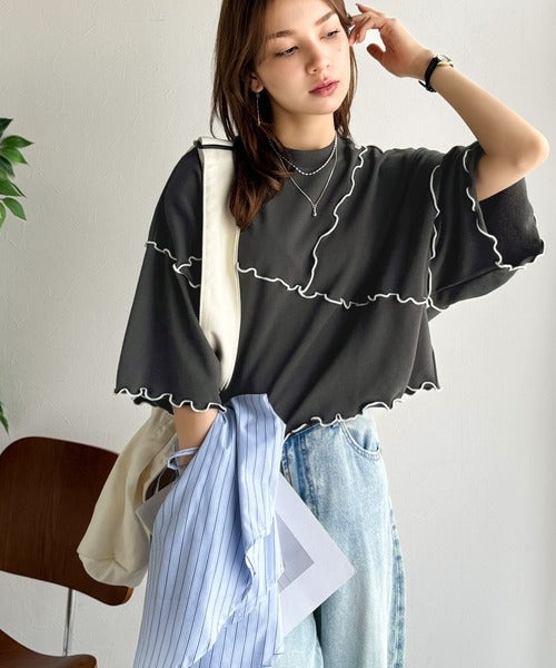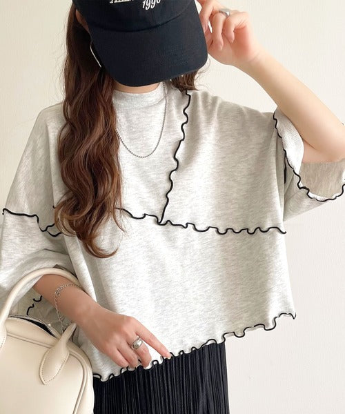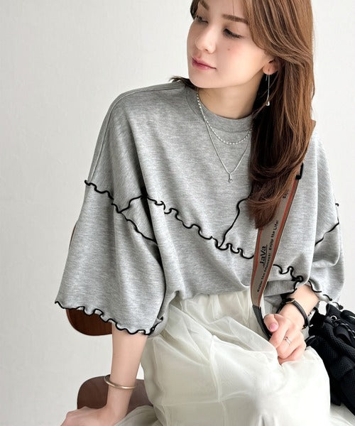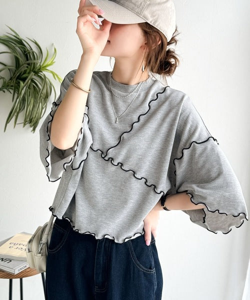 Tシャツより可愛く、スウェットより軽やか♪5分袖メロウ切替裏毛トップス ce1020310