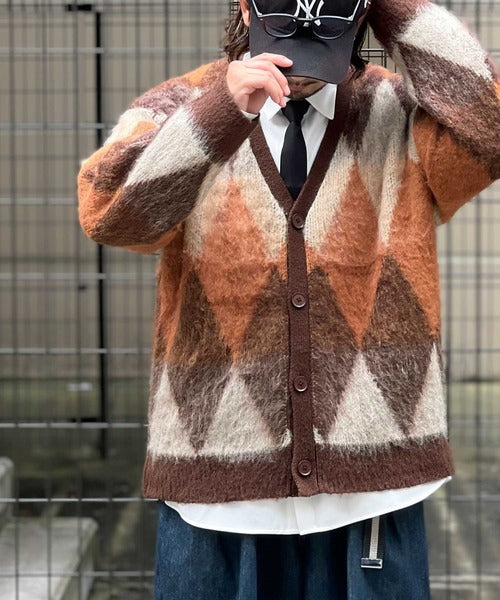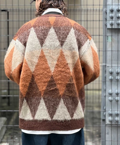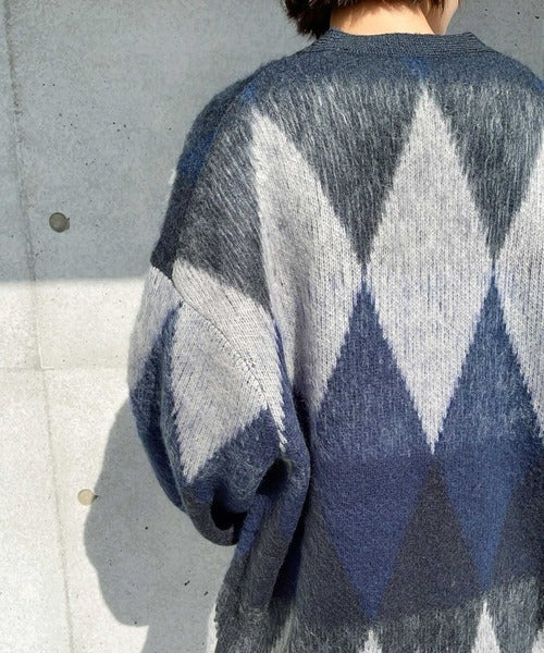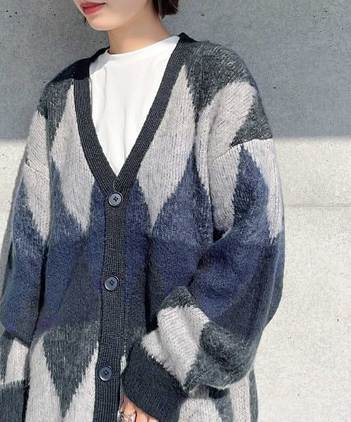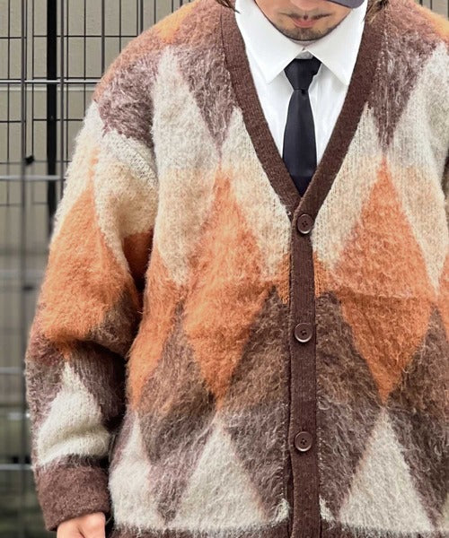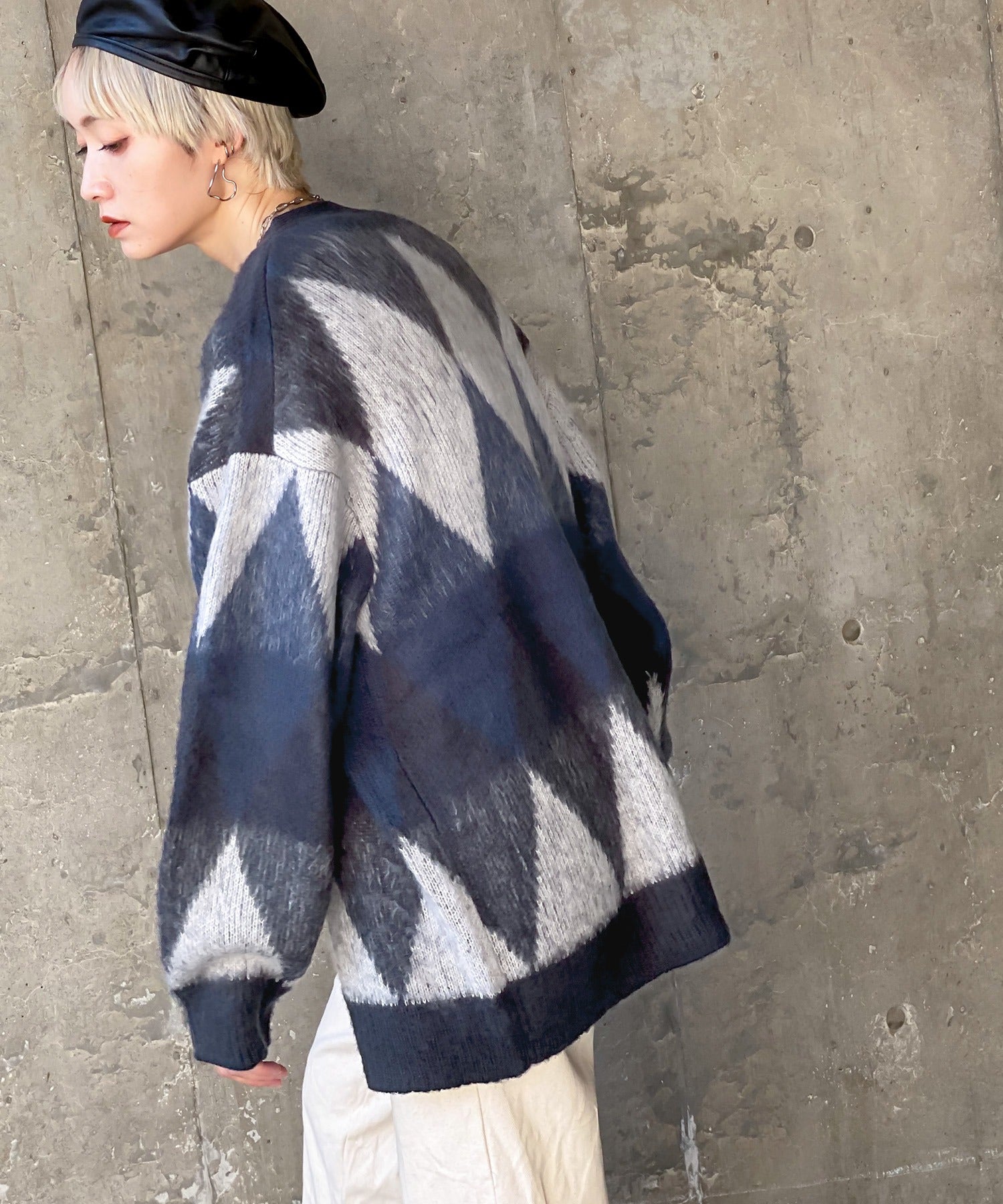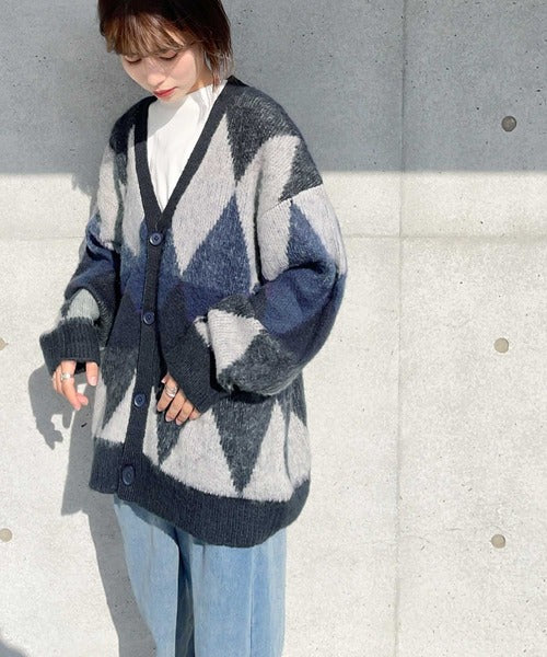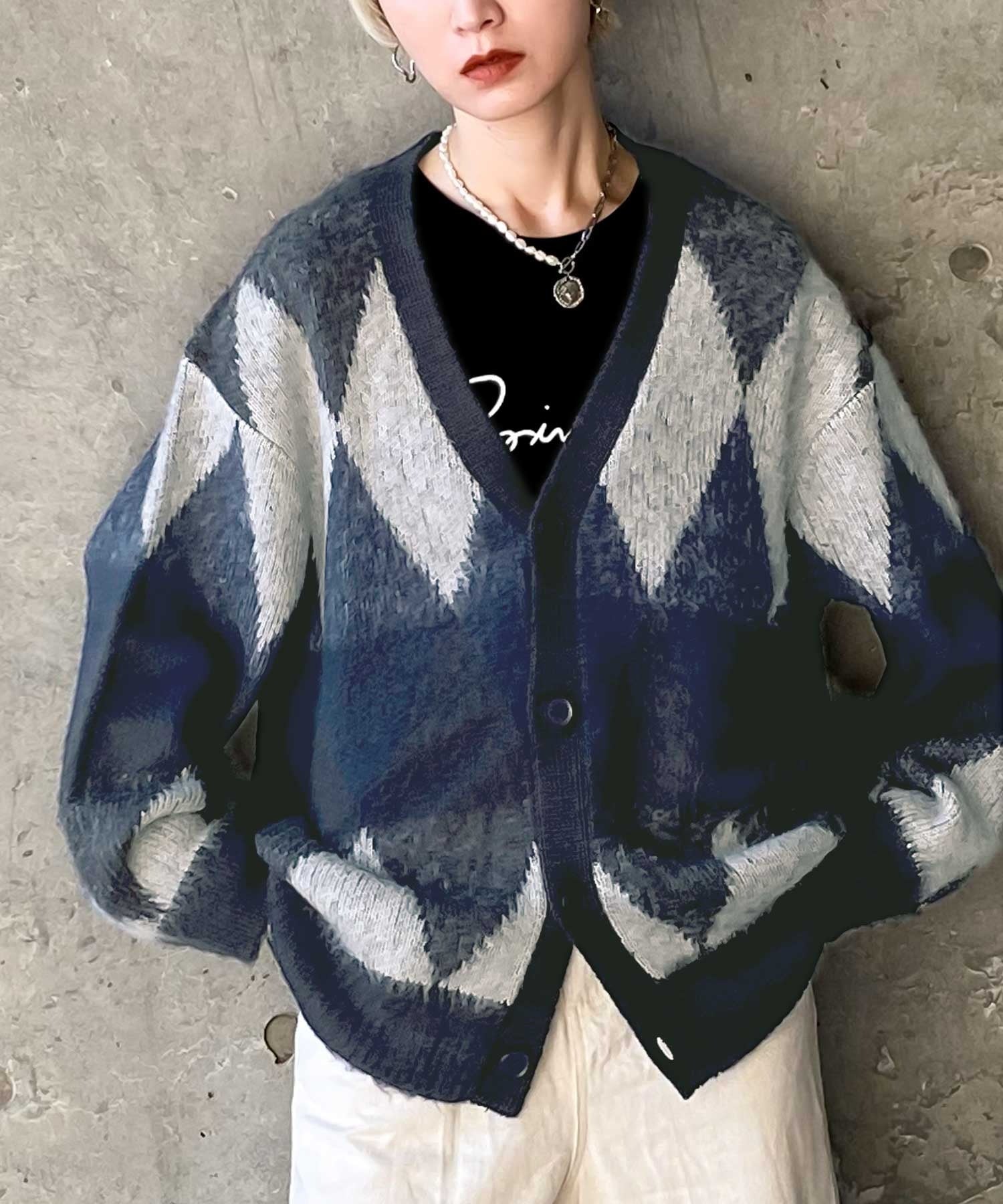存在感のあるアーガイル模様が新鮮なモヘアライクカーディガン。