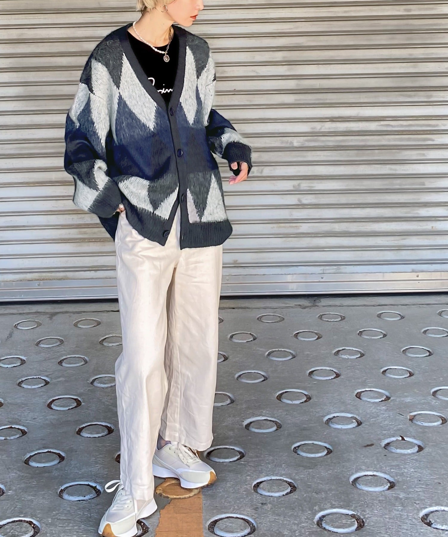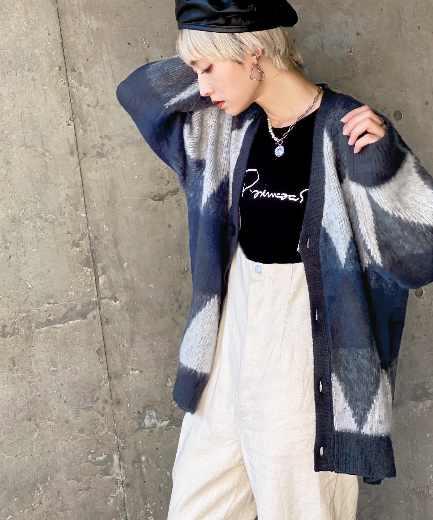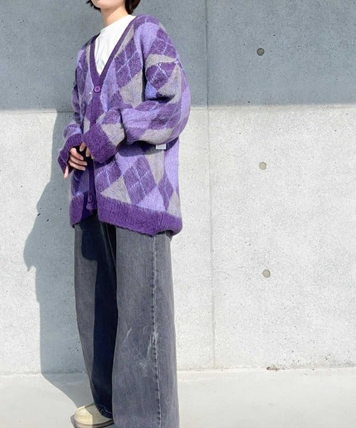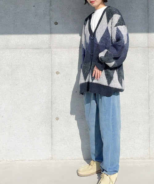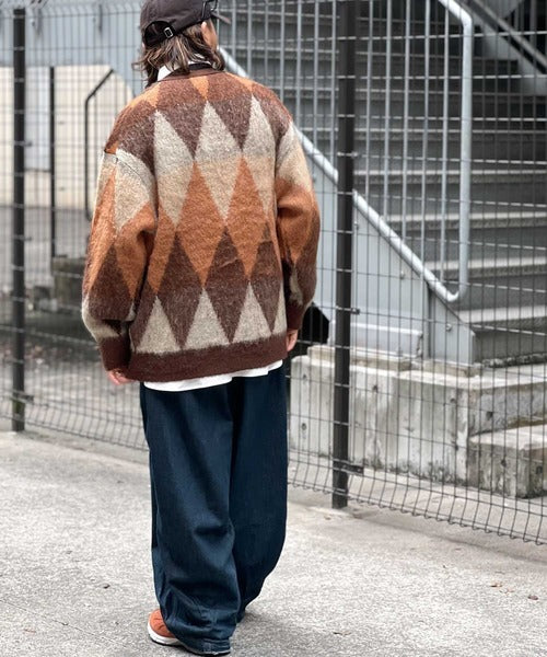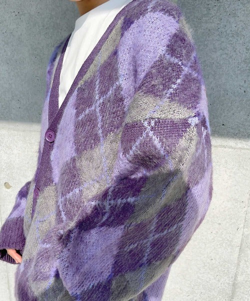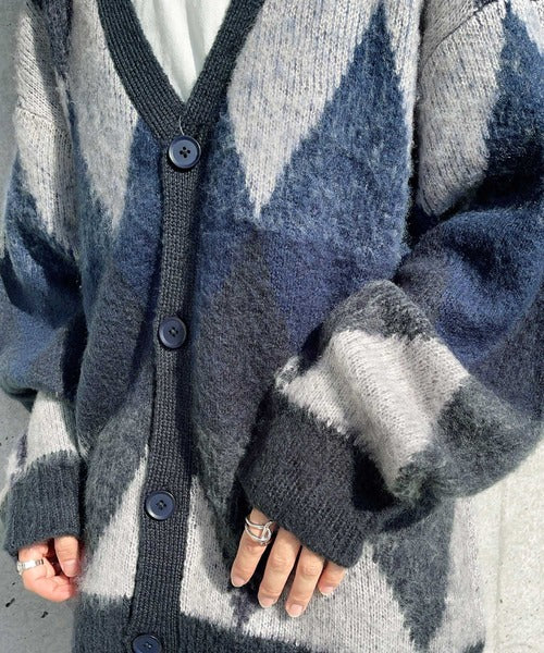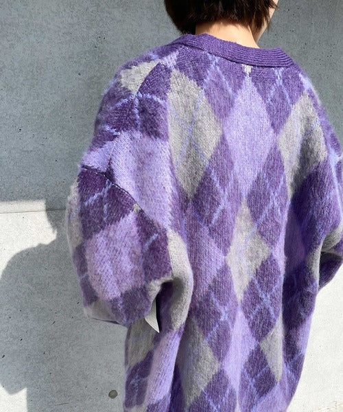 存在感のあるアーガイル模様が新鮮なモヘアライクカーディガン。