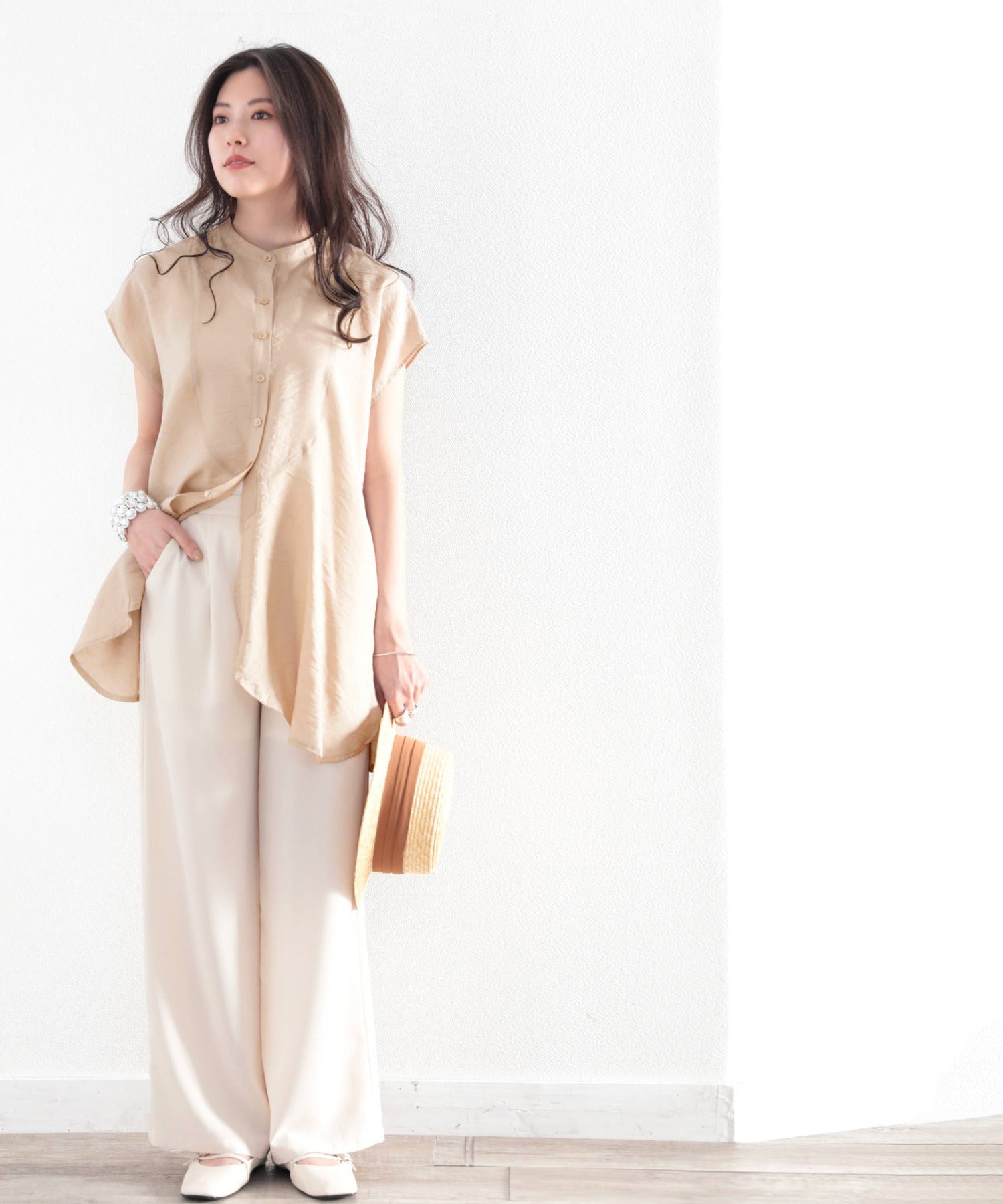 ワイドパンツと合わせるだけで、ドレープを楽しめる上品なコーデが完成。