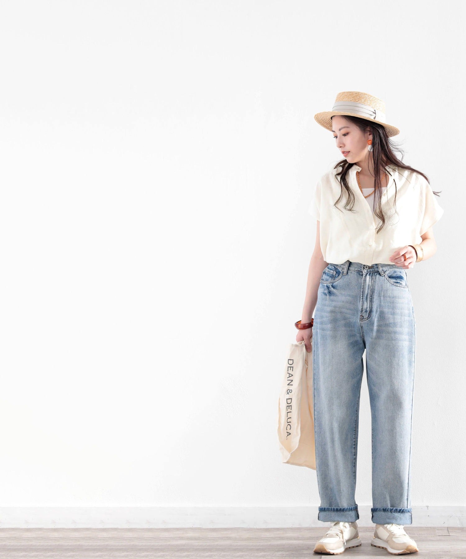 パンツにインしてすっきりとした印象に、オールインで印象が変わる万能シャツ。