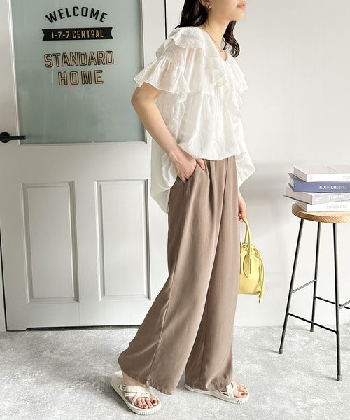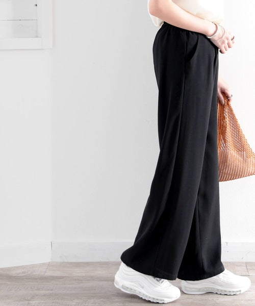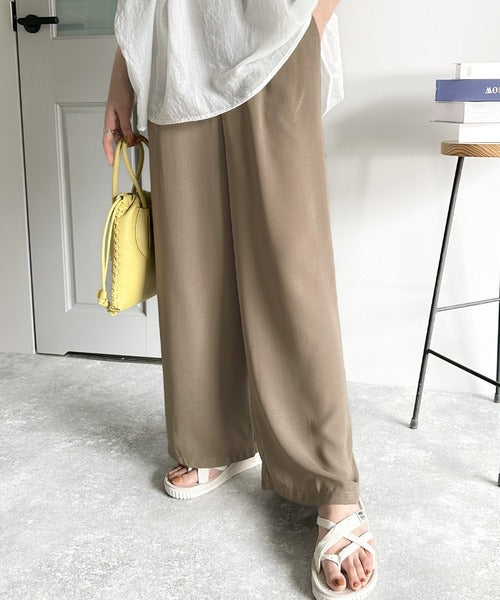 ふんわり揺れる柔らか素材のリネンライクワイドパンツ。