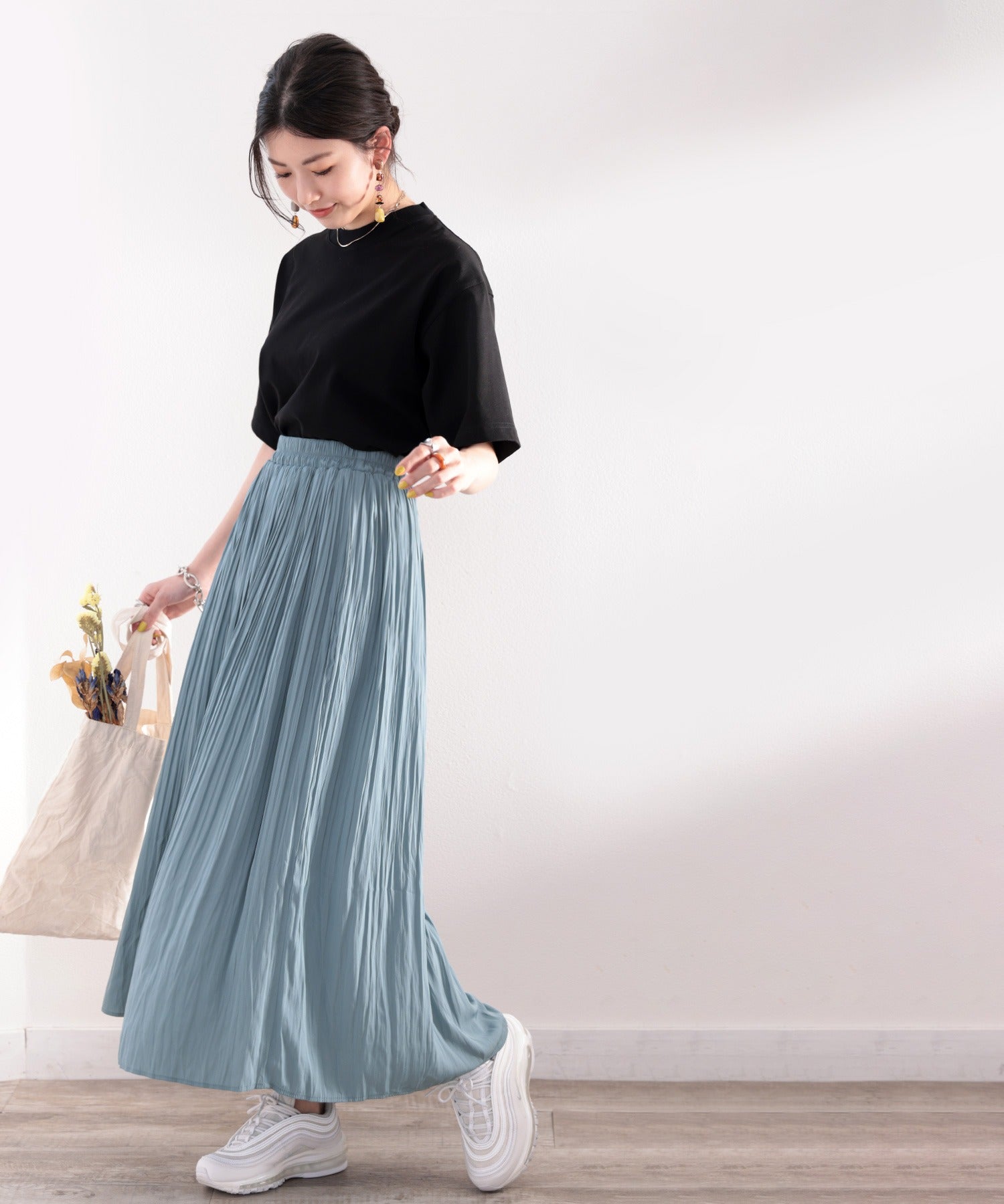 プリーツスカートなど様々なボトムに合わせやすいです。