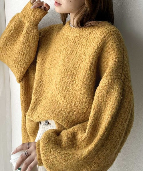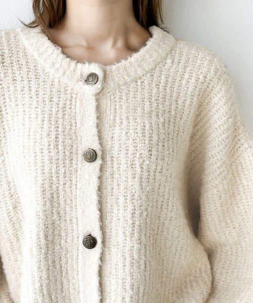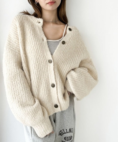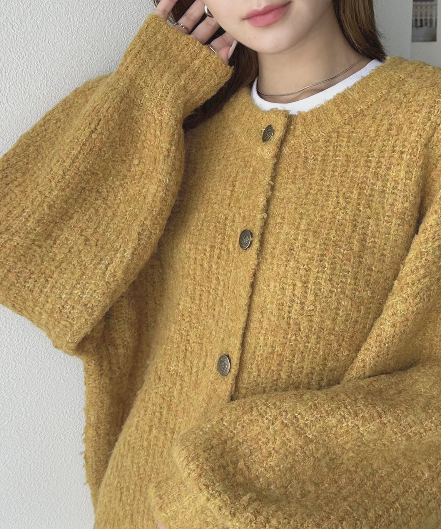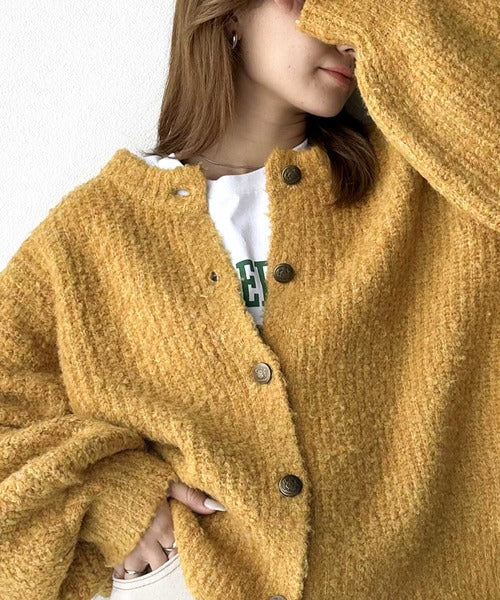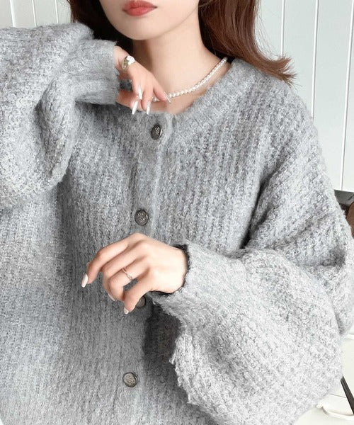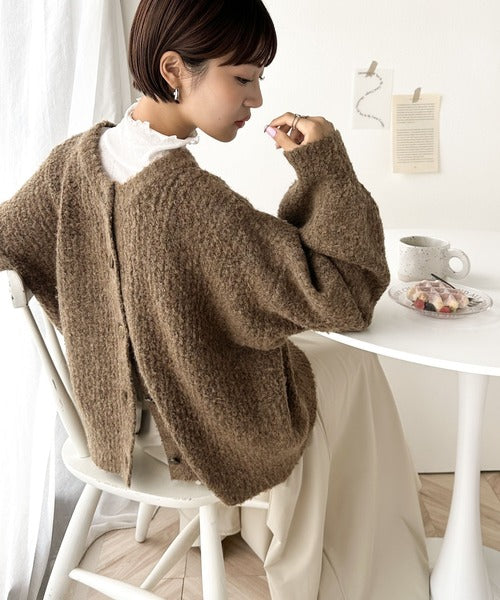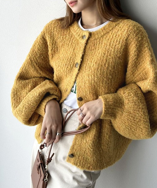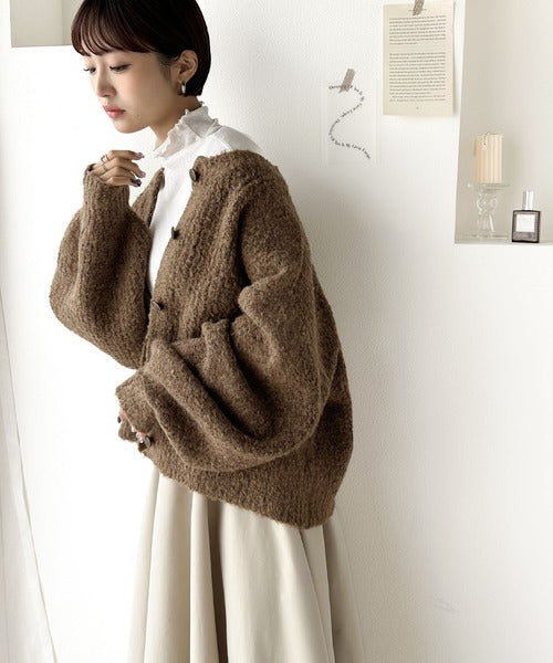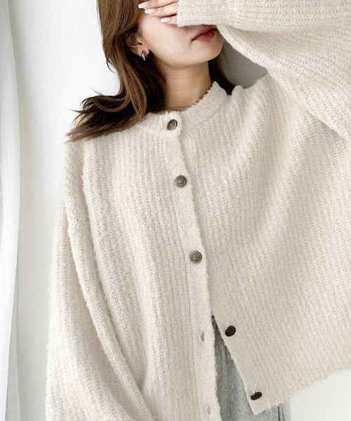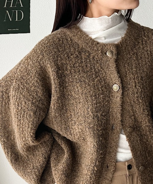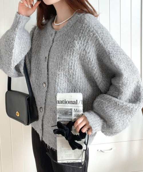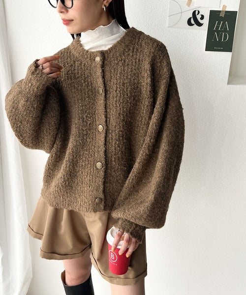 風合いがいいふわふわのブークレ糸を使用した短丈の畦編みカーディガン。
