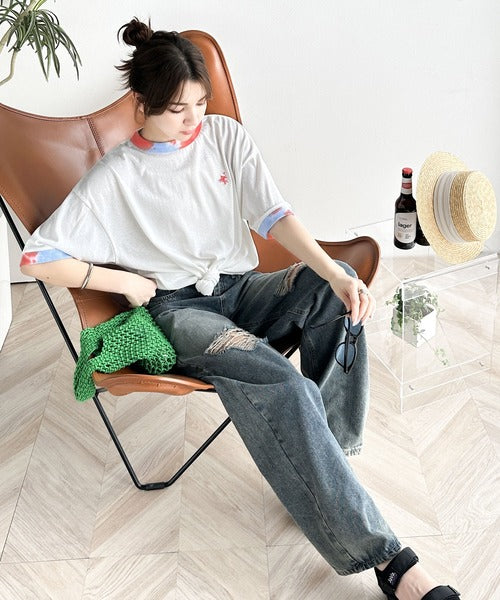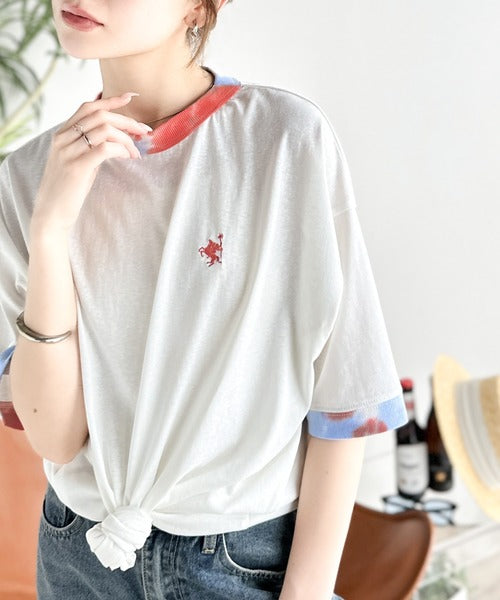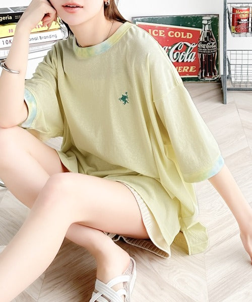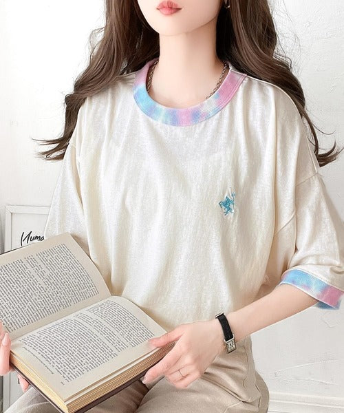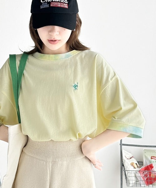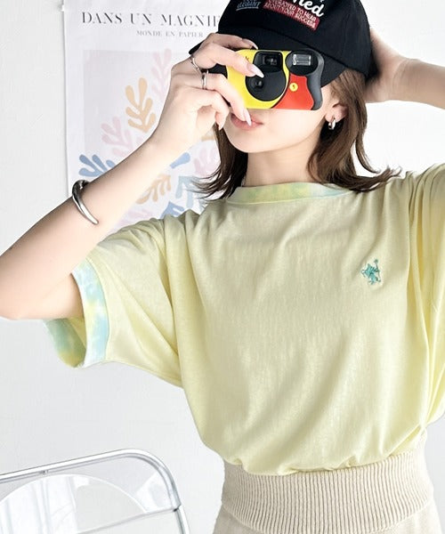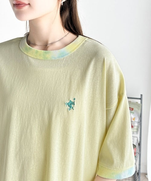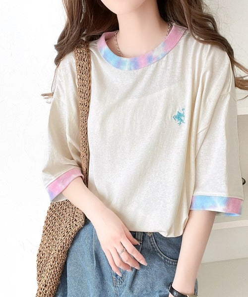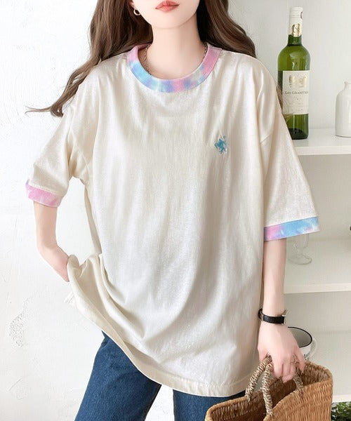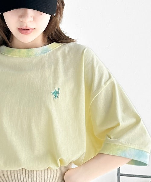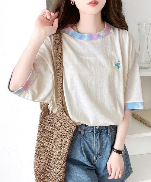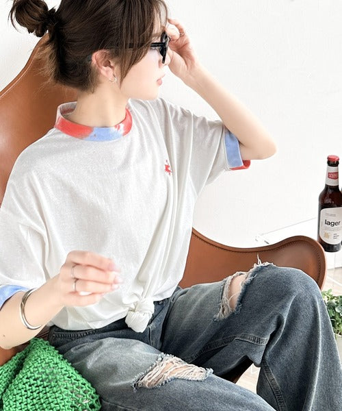 レトロでポップな大人リンガーT。胸刺繍タイダイリンガー半袖T ce1050158