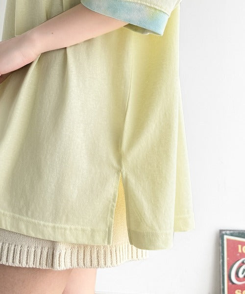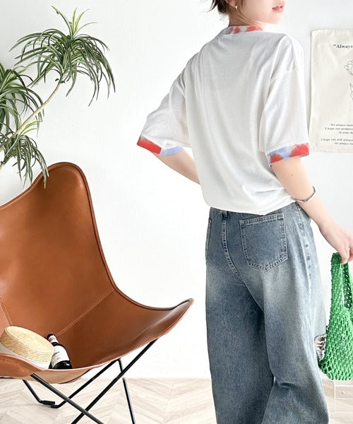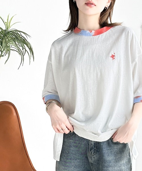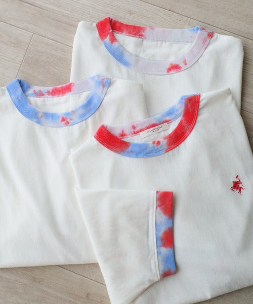 衿と袖のタイダイ配色が特徴的なリンガーTシャツ。
