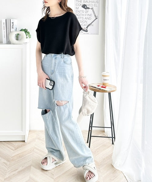 ゆったり感がありつつ、フレンチスリーブが美しいデコルテを叶える優秀トップス。