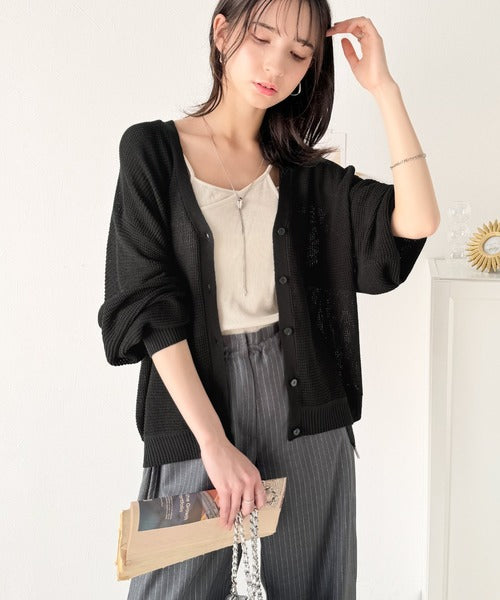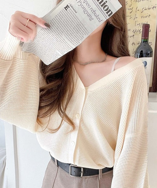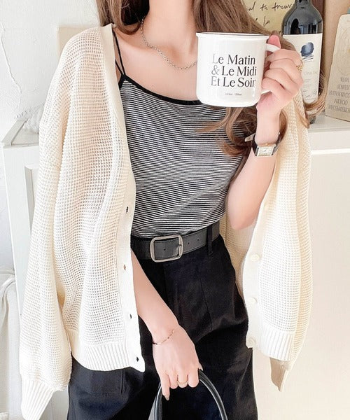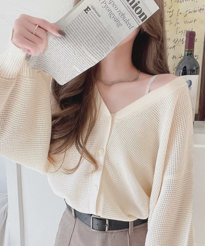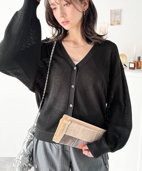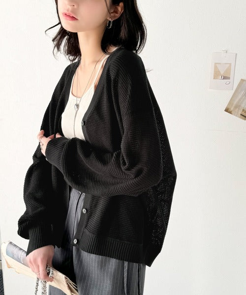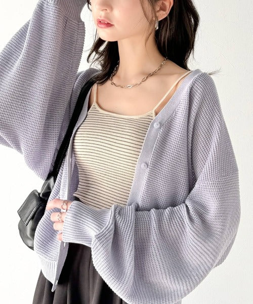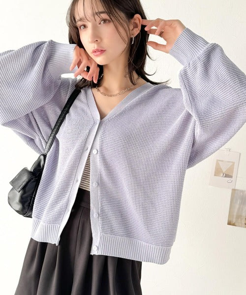 レトロな色味と程よい透け感が魅力のワッフルニットカーディガン。