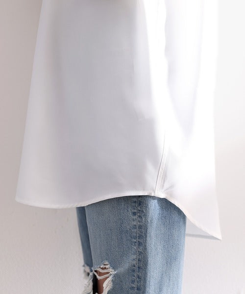 デコルテを見せた抜き襟スタイルで無造作なシャツコーデも◎