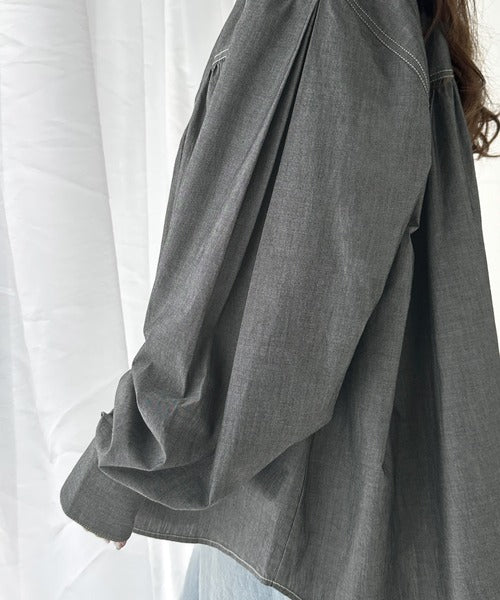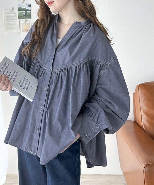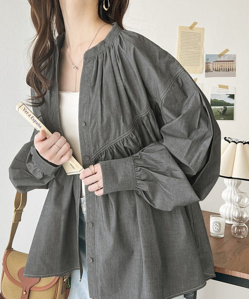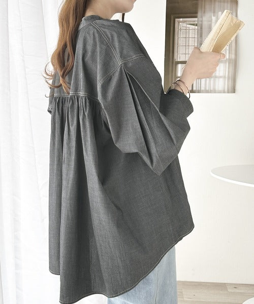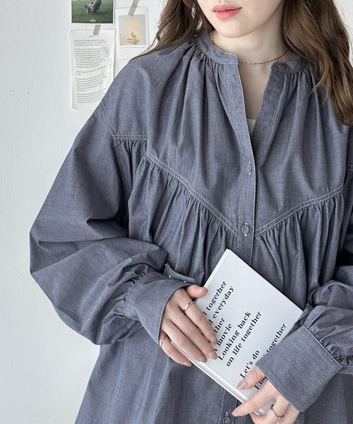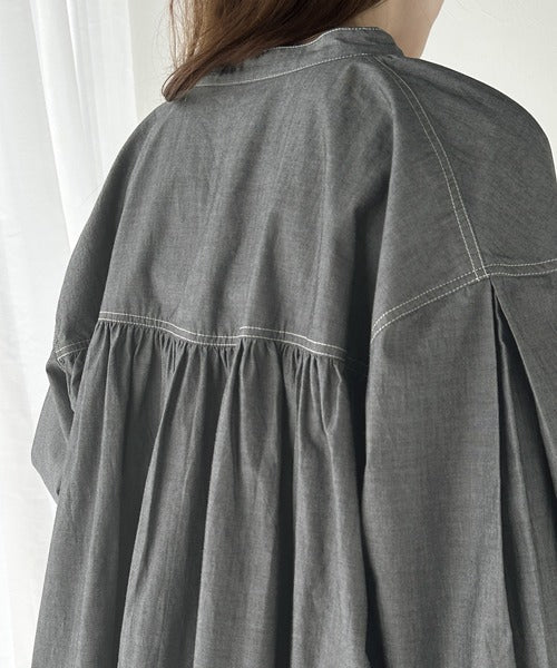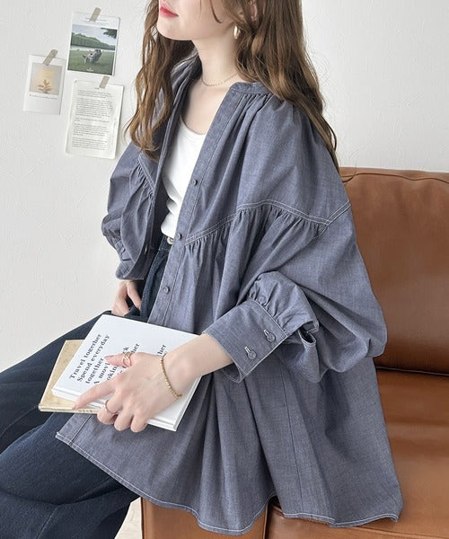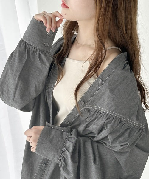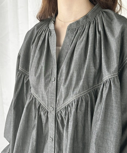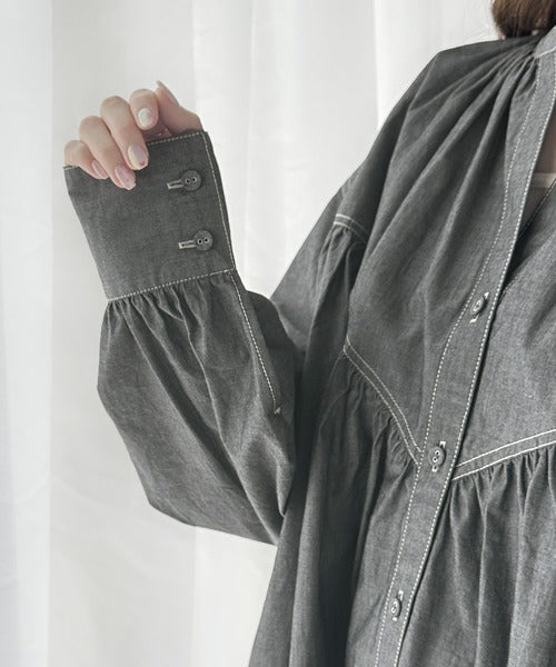 さっと着るだけで映える。配色ステッチギャザーダンガリーシャツ。 ce1070073