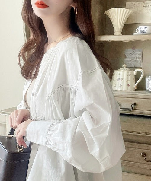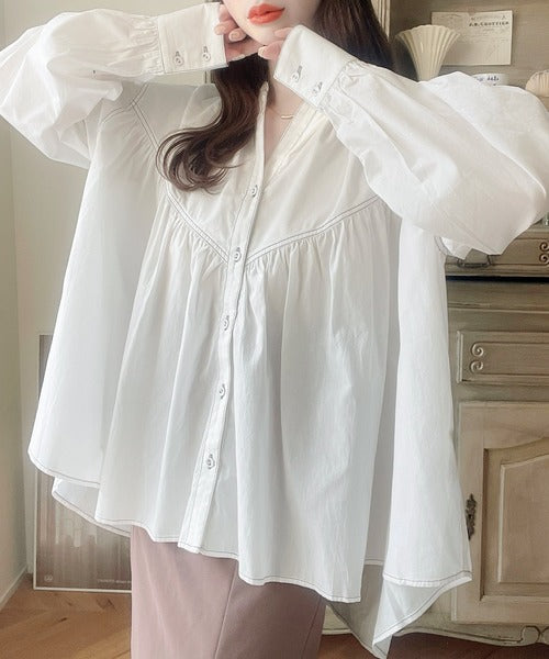 胸元のたっぷりギャザー×配色ステッチが可愛いボリュームスリーブブラウス。