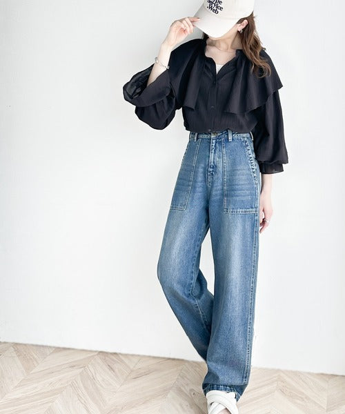 ボタンを後ろにして、フロントはスッキリさせるとエレガントな雰囲気にもなり、少し太めボトムスに合わせることでより今っぽスタイルに◎
