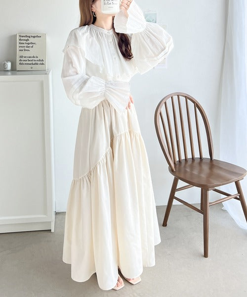 顔周りには大きなフリル襟で華やか見えも叶えてくれます。