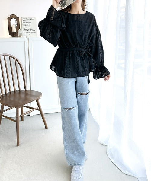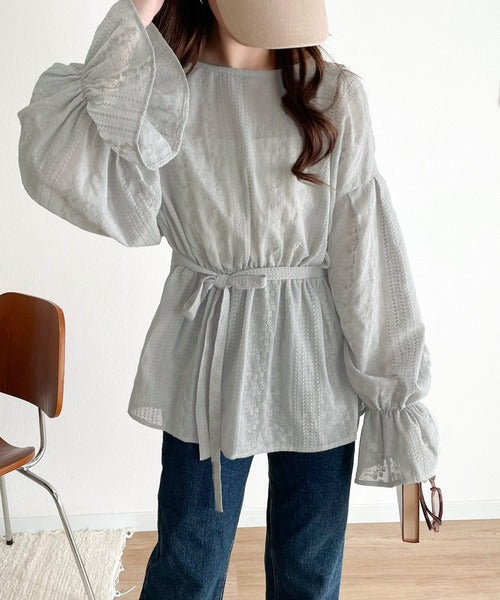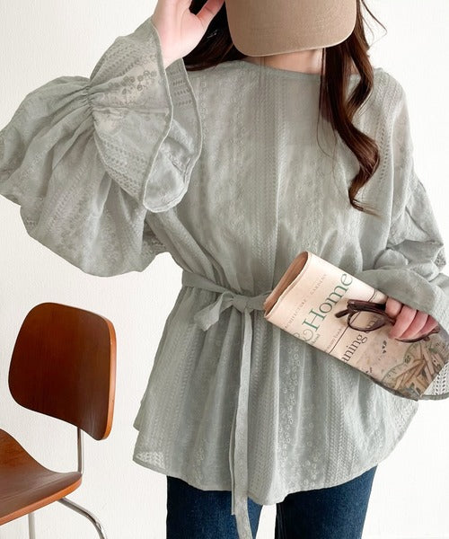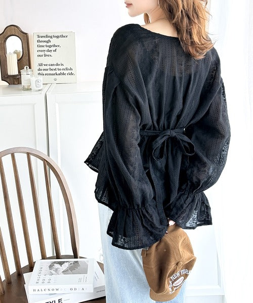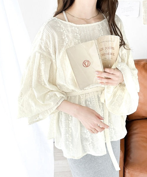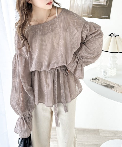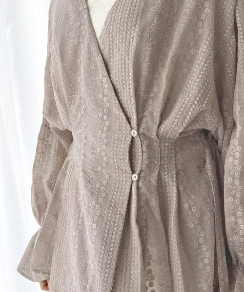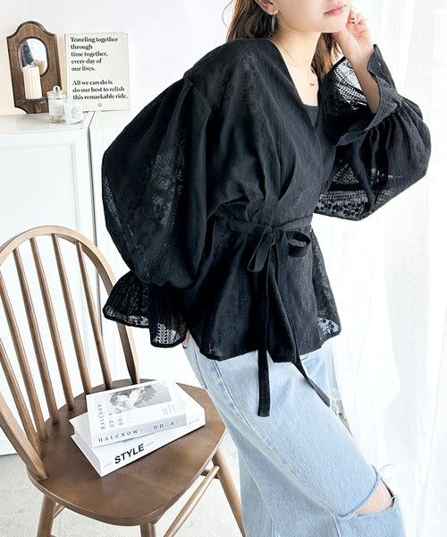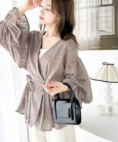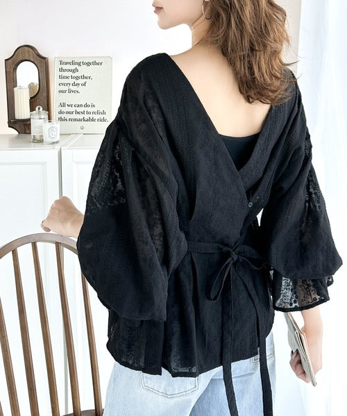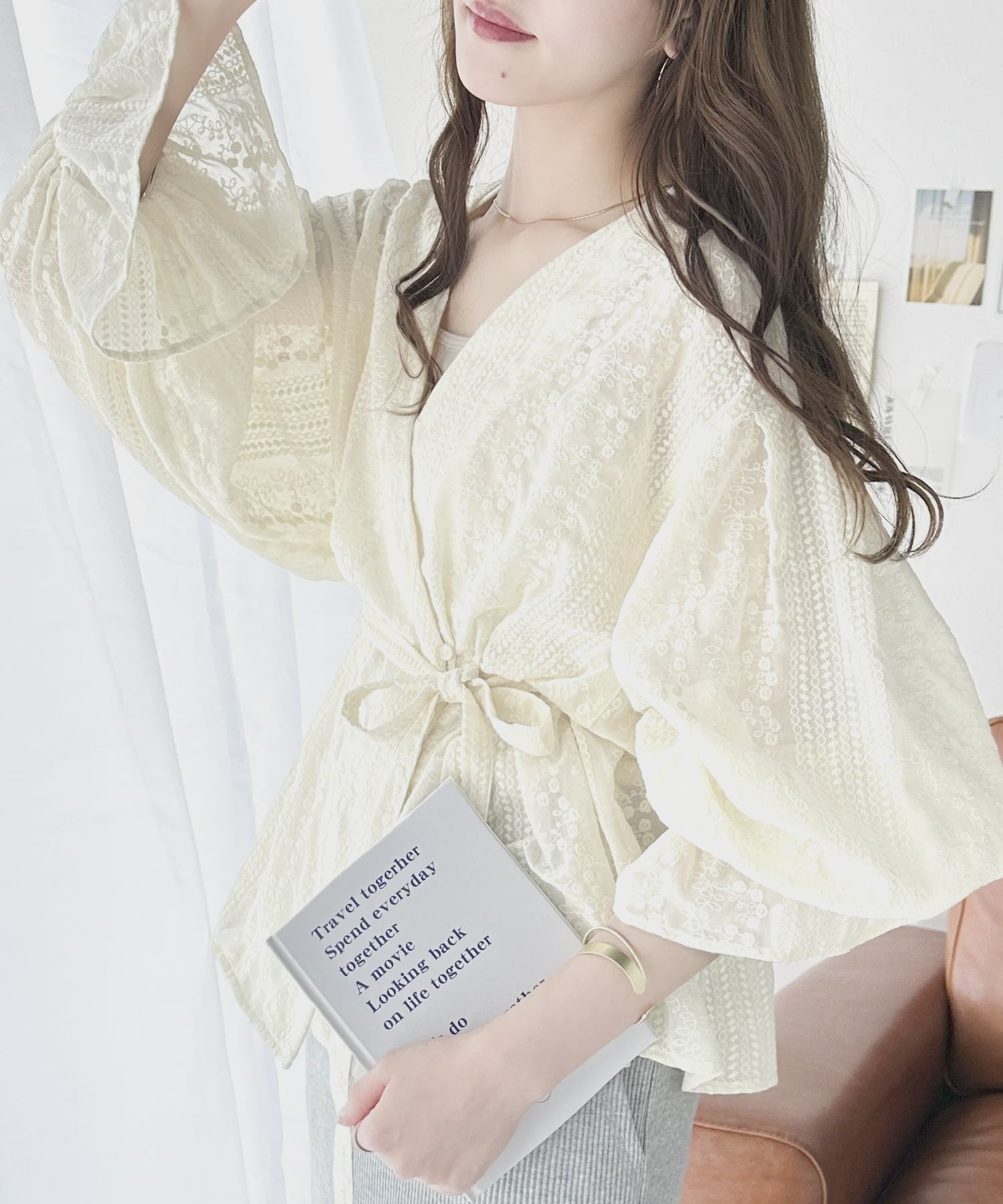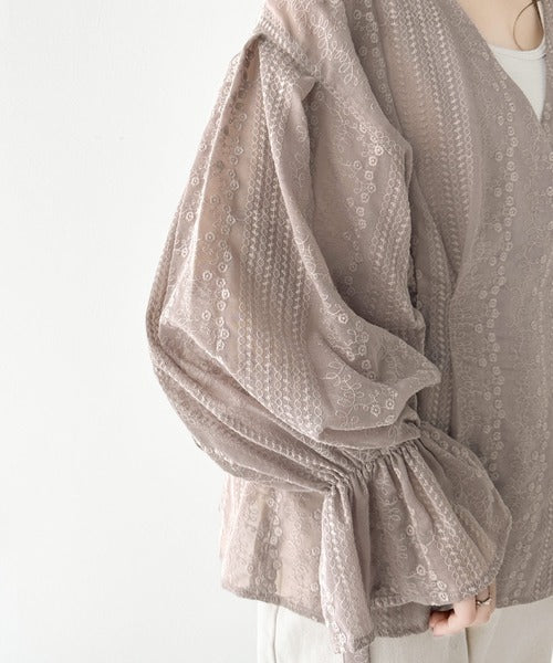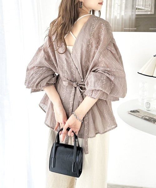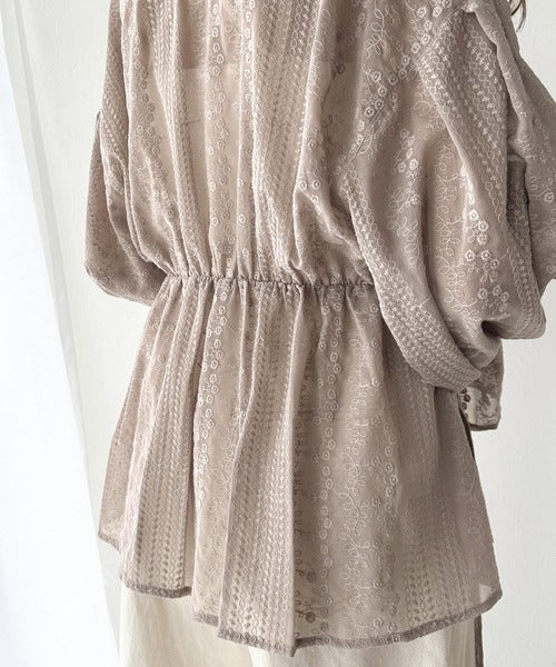 贅沢なヴィンテージ風刺繍を施したシアーなカシュクール2wayブラウス。
