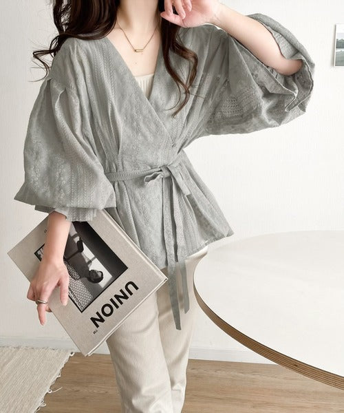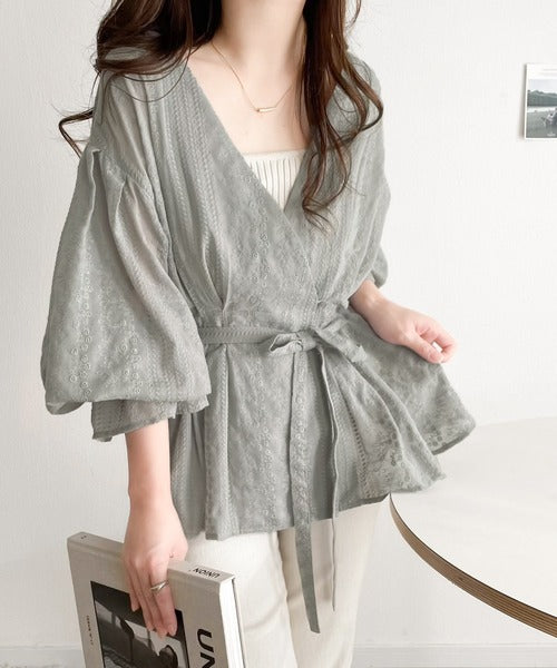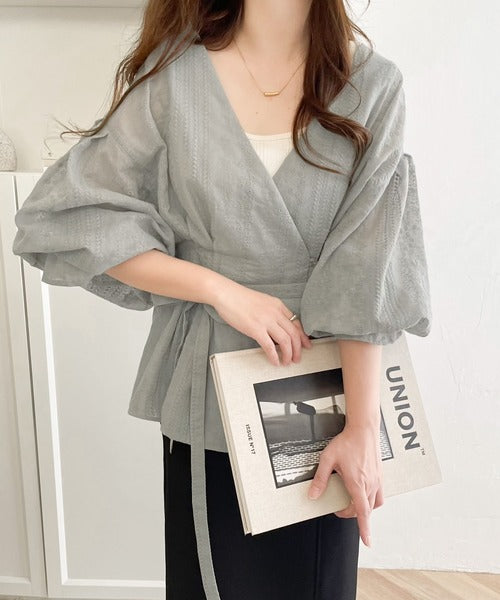 ヴィンテージ風刺繍がラグジュアリーなカシュクールブラウス。