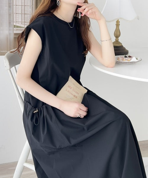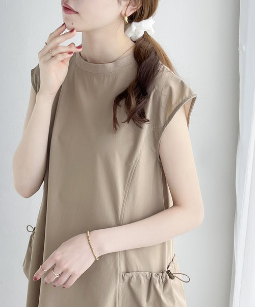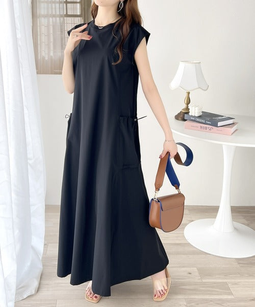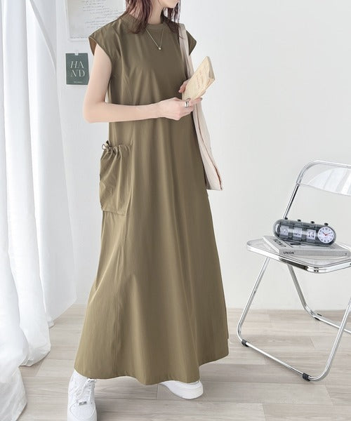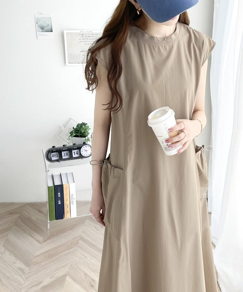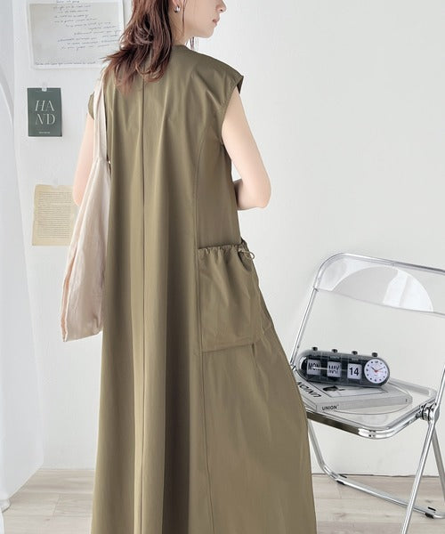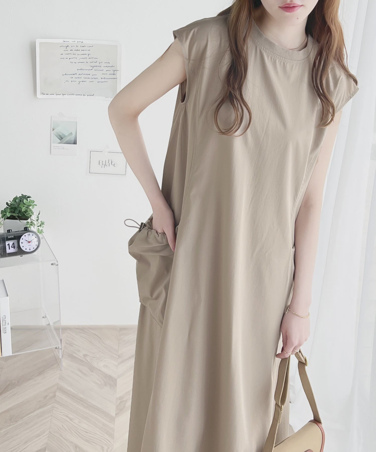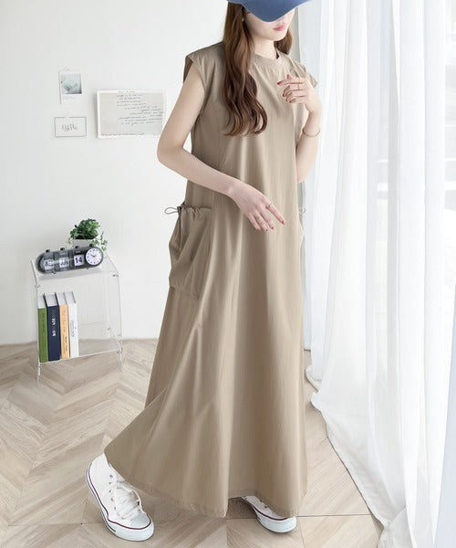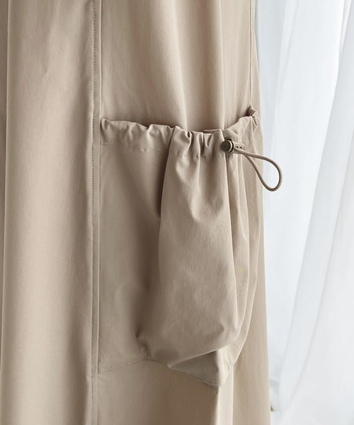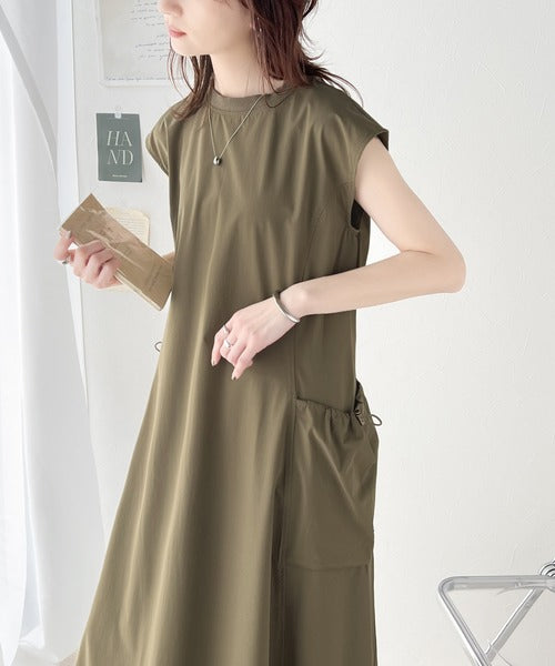 両サイドにドロストビッグポケットがついたナイロン素材のワンピースです。