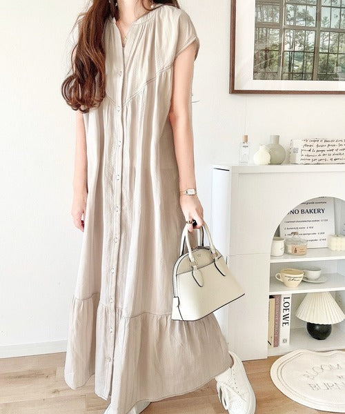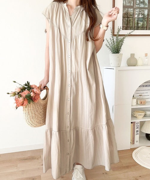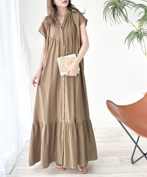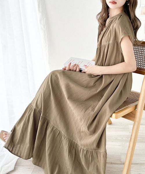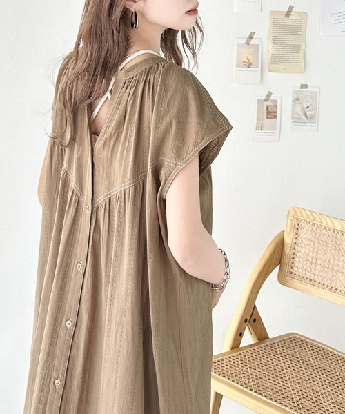 表面感のあるカラミストライプドビー生地を贅沢に使用したフレンチスリーブのワンピース。
