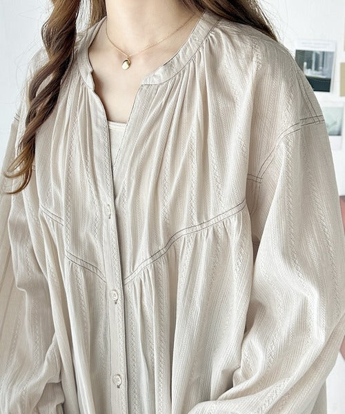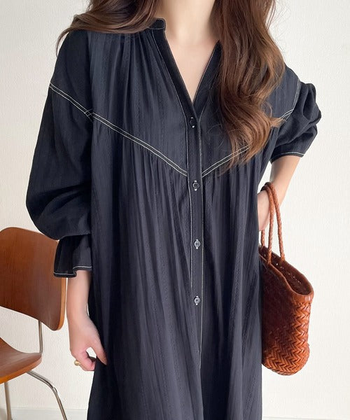 胸元のV切替とボリュームギャザー×フロントのスキッパー開きでスッキリ見えを叶えてくれます◎