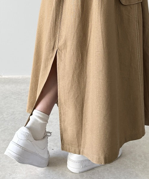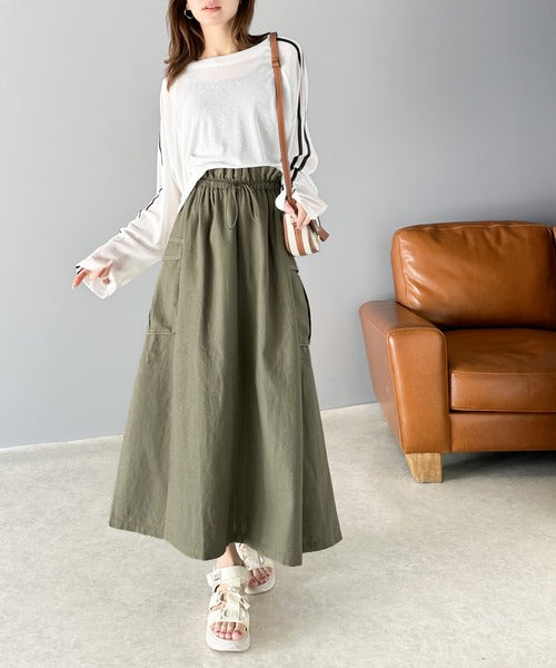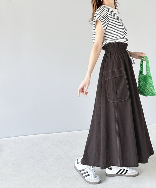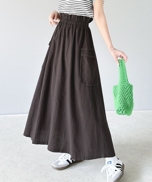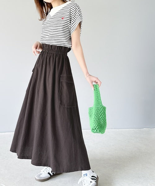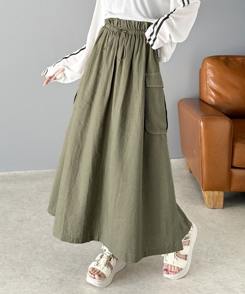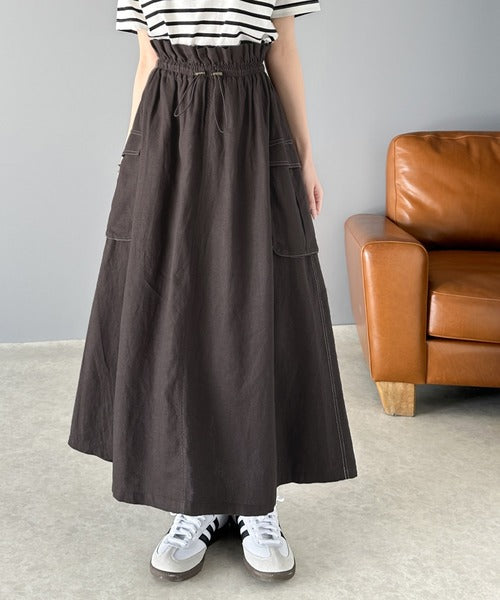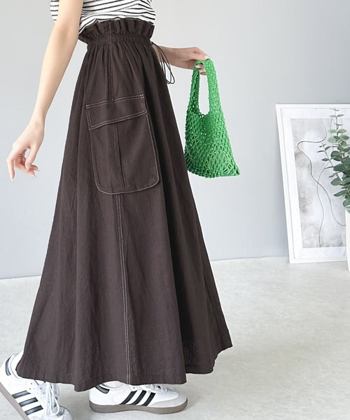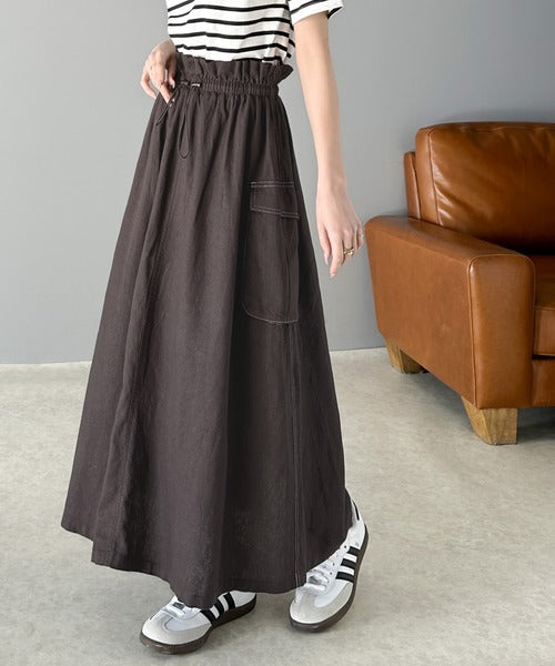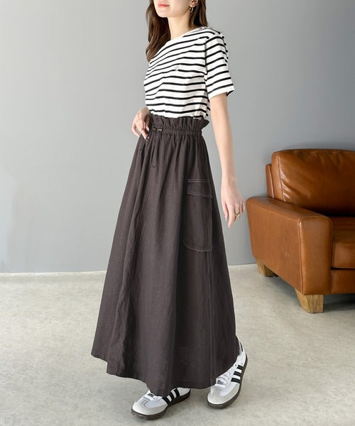ふんわりカジュアル。麻混ウエストドロスト配色ステッチロングスカート ce1070097
