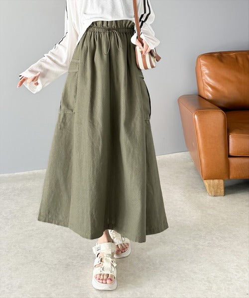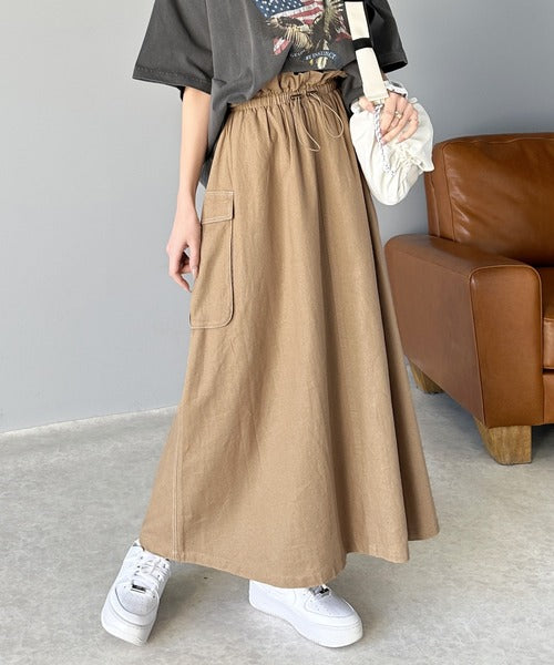 アシメデザインのカーゴポケットとウエストのドローコード使いがポイントのフレアスカート。