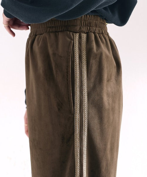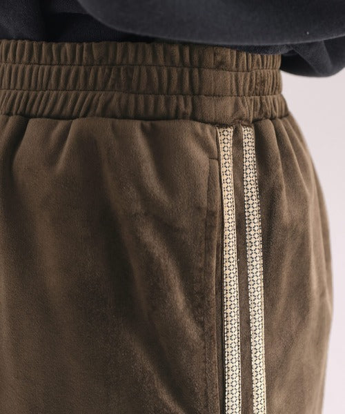 カジュアルなイメージのトラックパンツをベルベット生地に落とし込んで上品な印象に仕上げました。