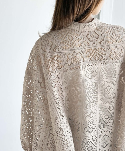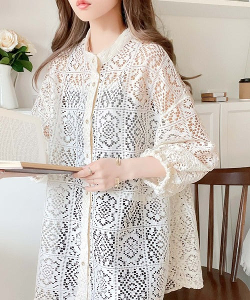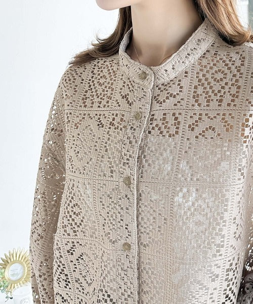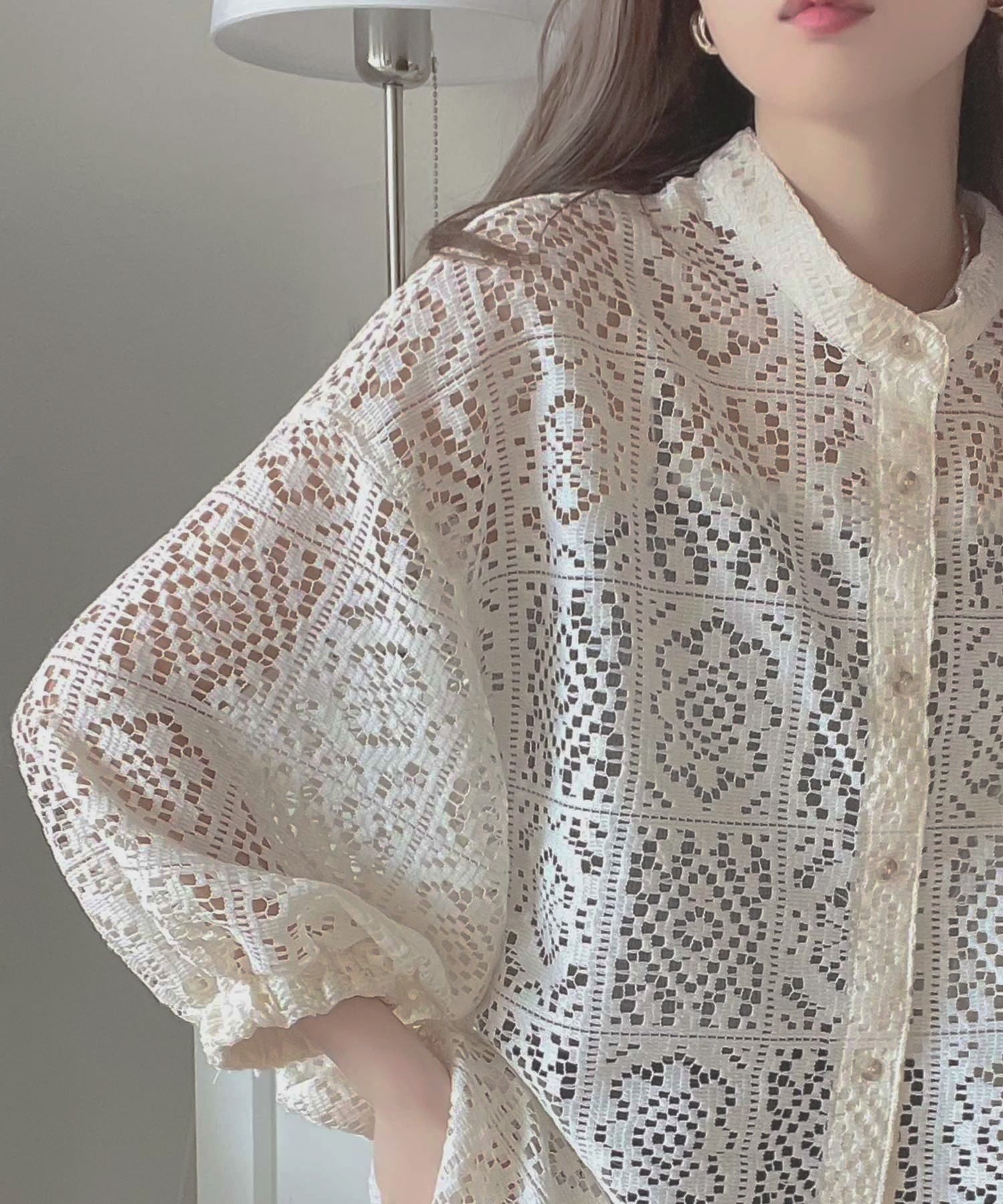 オーバーサイズのバンドカラーシャツを、レトロなパネルレースで仕上げました。