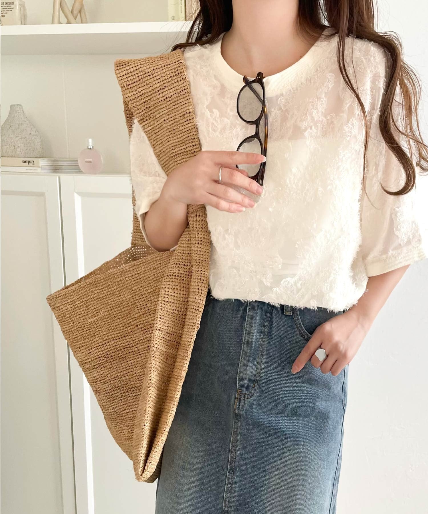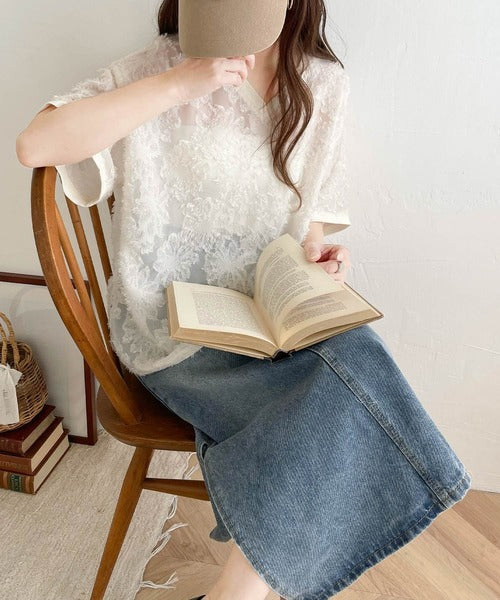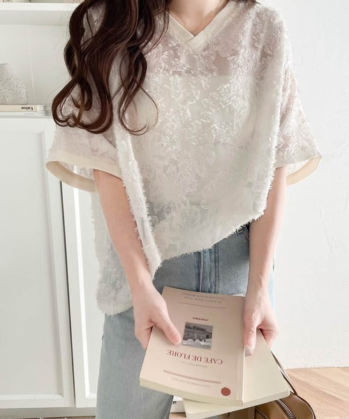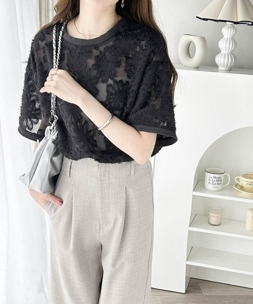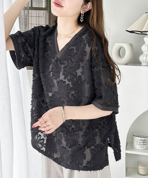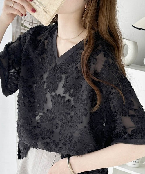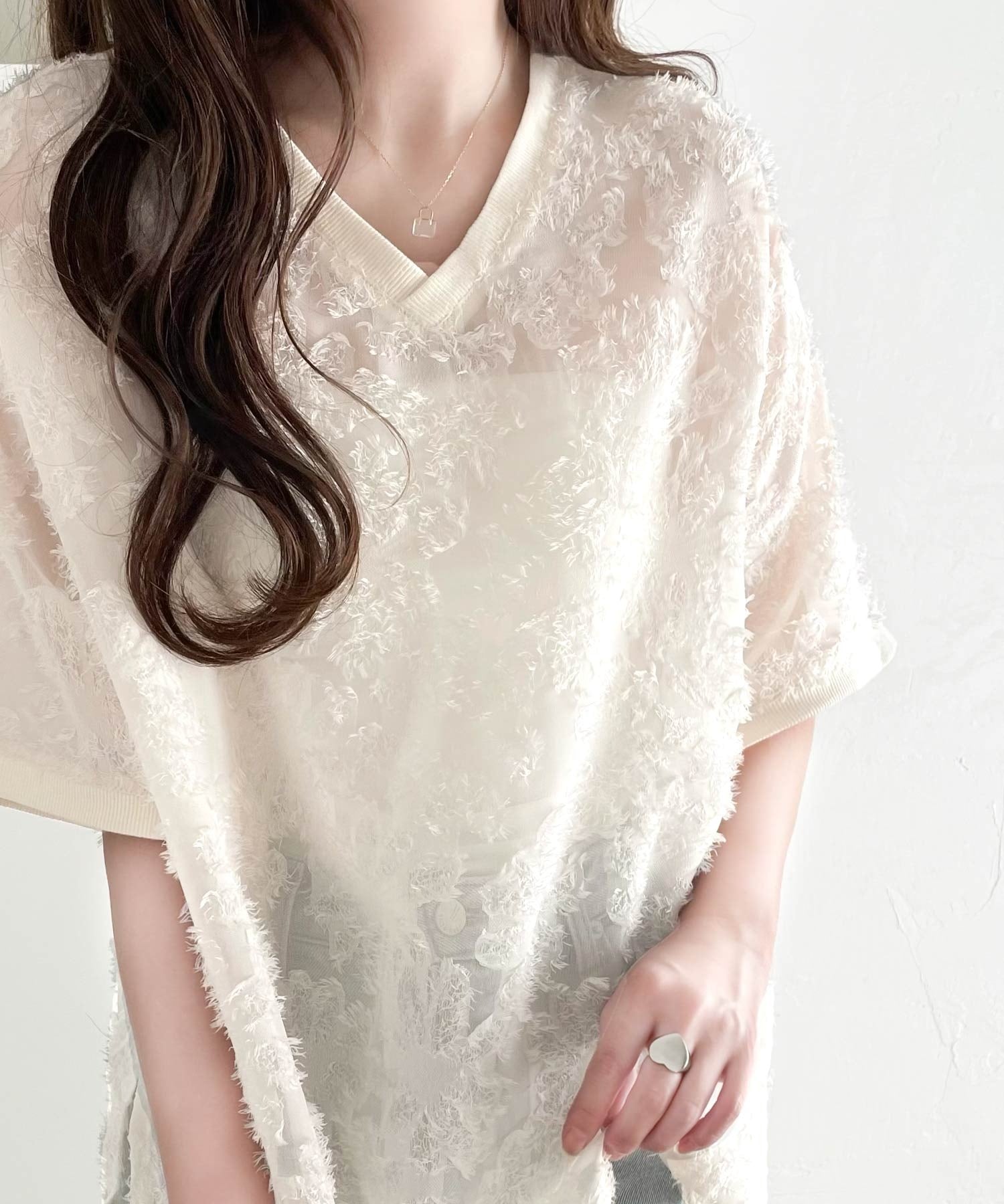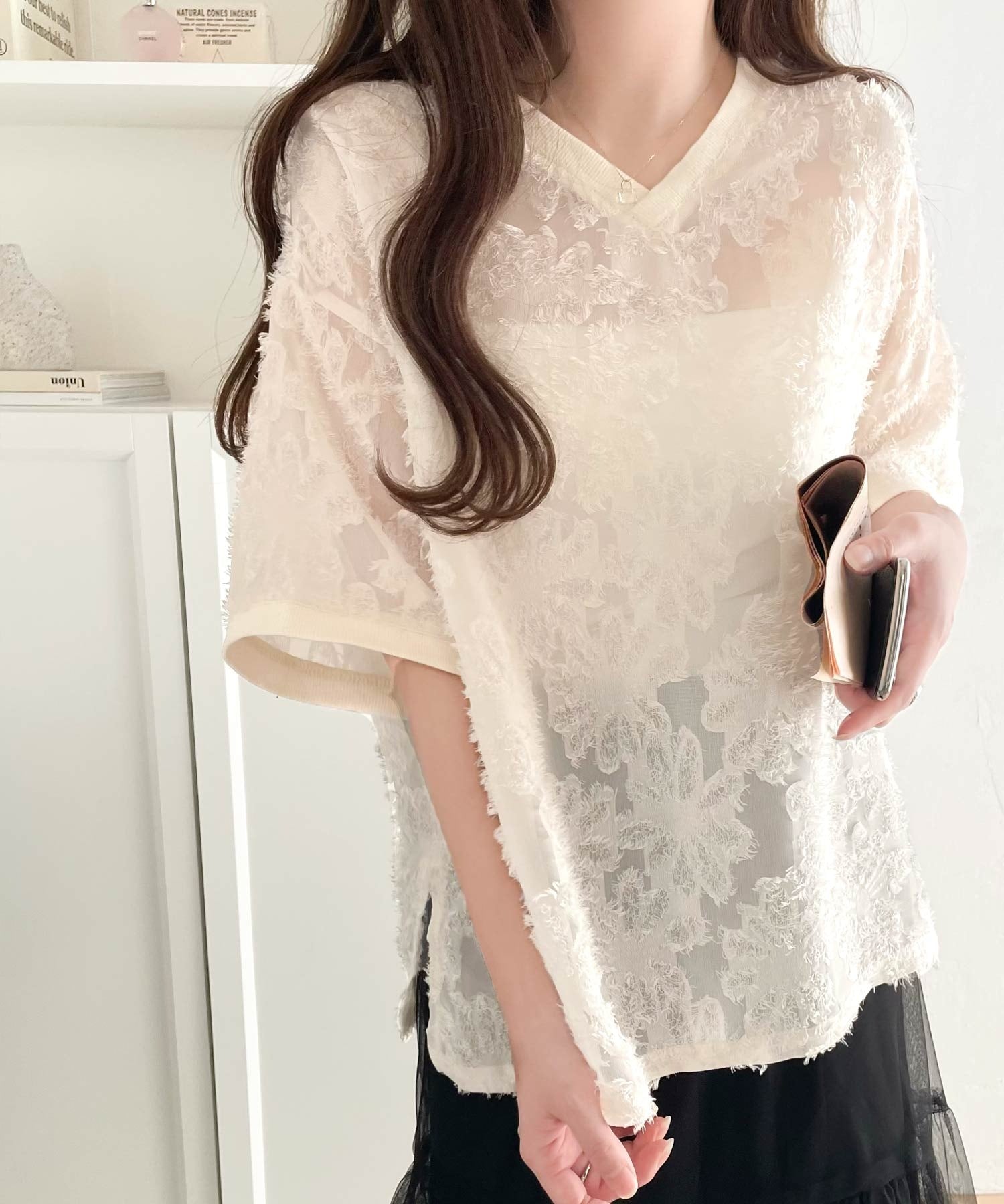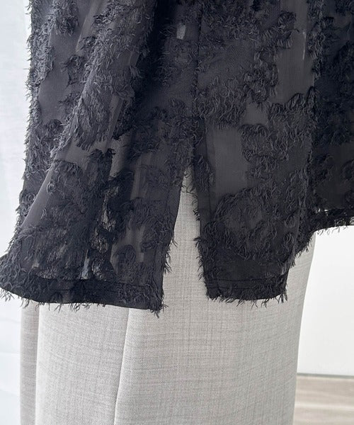 フリンジの様なシアー花柄で着るだけでコーデが決まる主役級トップスです。