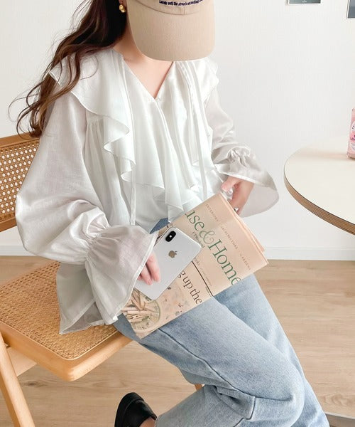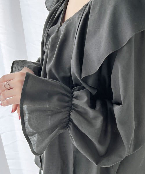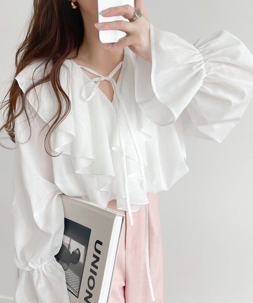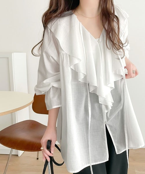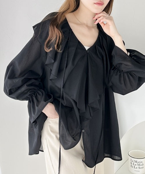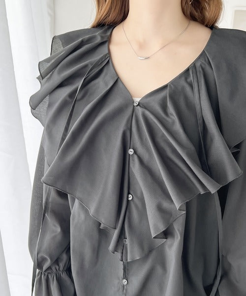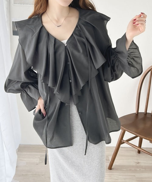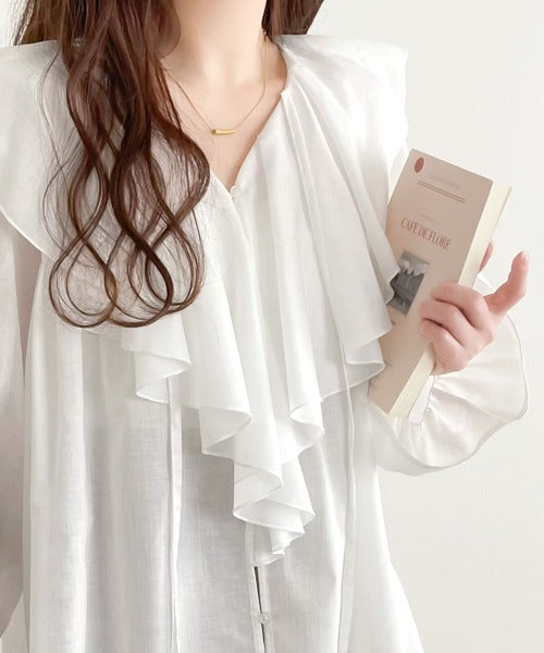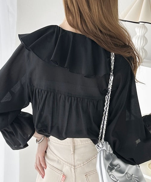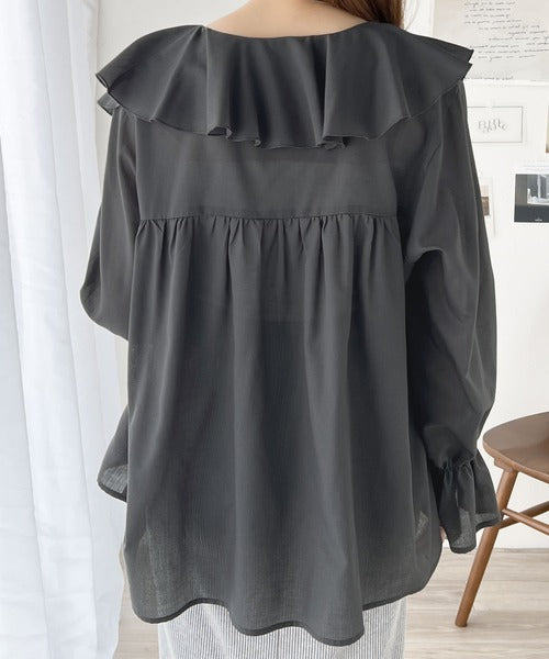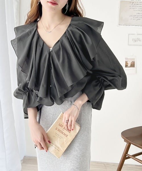 程よい透け感のシアー素材で甘すぎないラッフルフリルカラーブラウス。