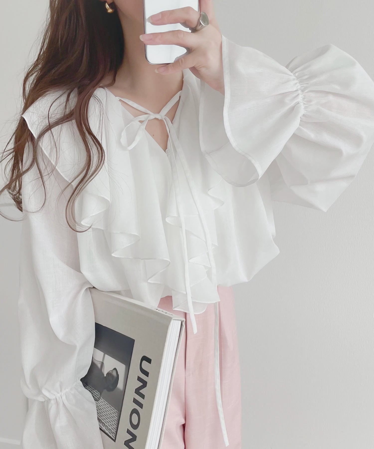 フロントフリルが顔回りを華やかにしてくれるトレンドアイテムです。