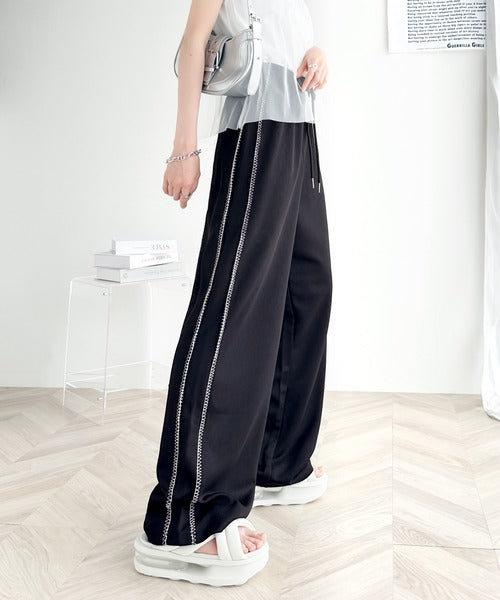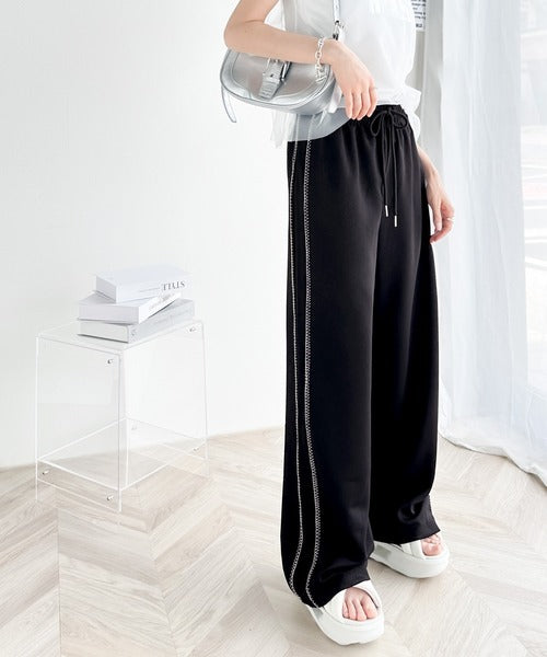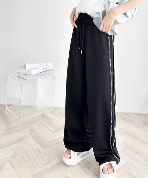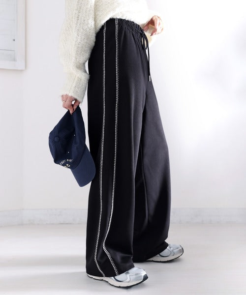 両サイドに施したステッチラインの刺繍がシンプルながらもゆるっとこなれ感を演出してくれるワイドパンツ。