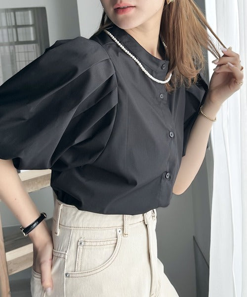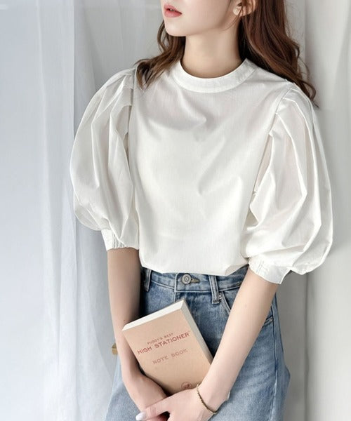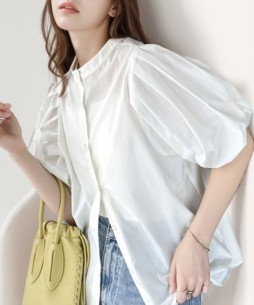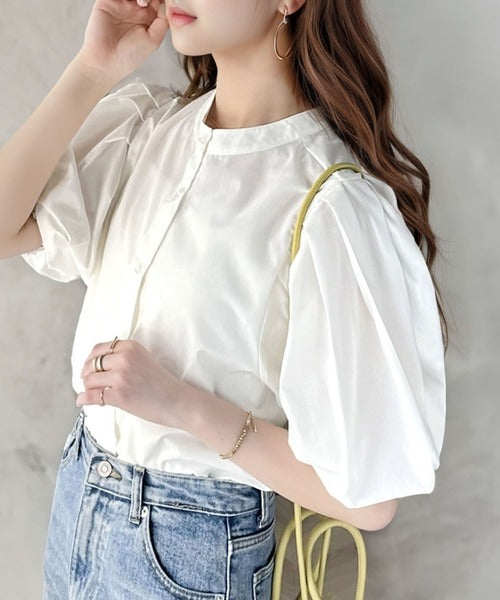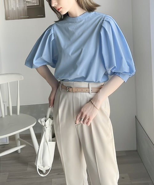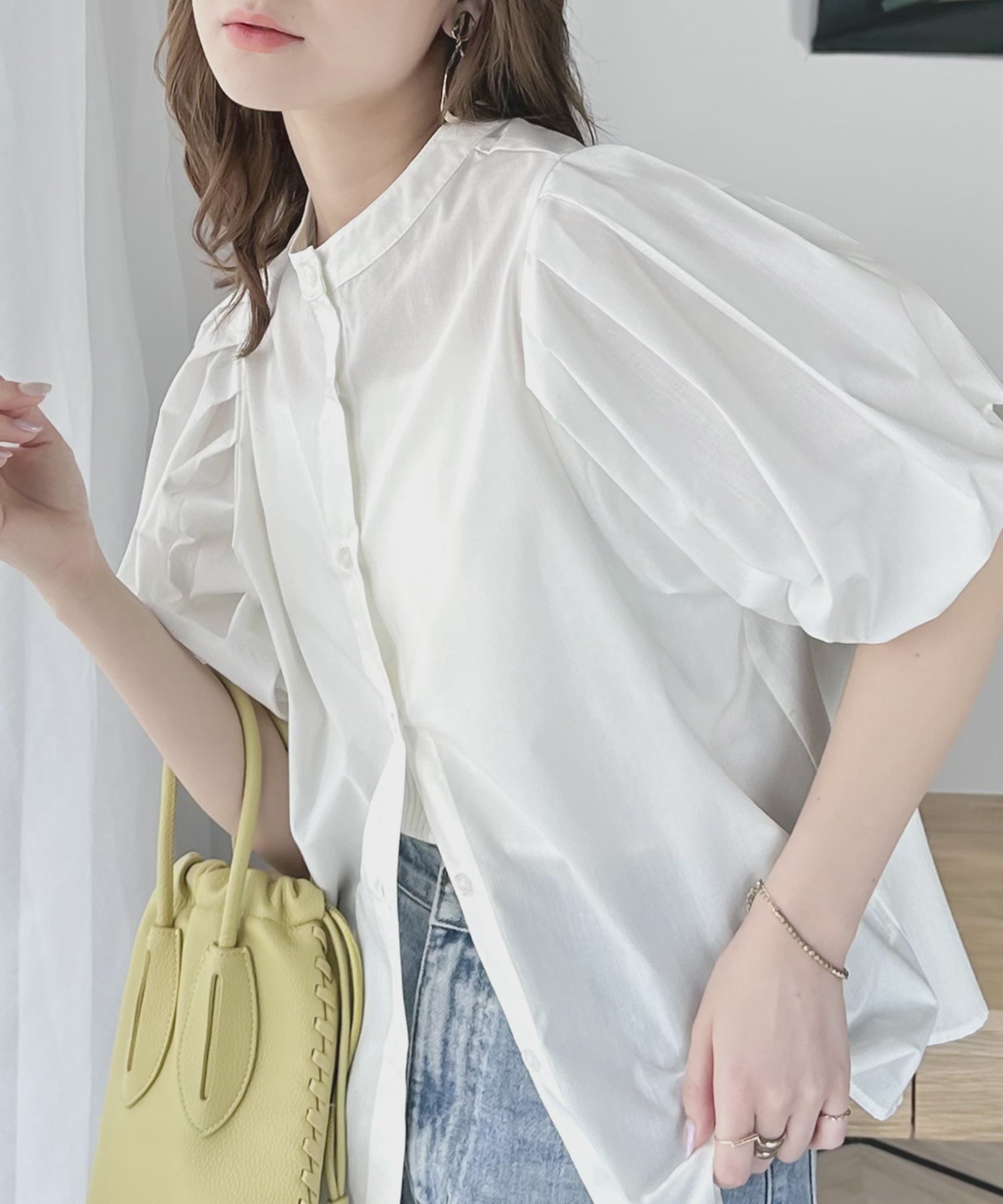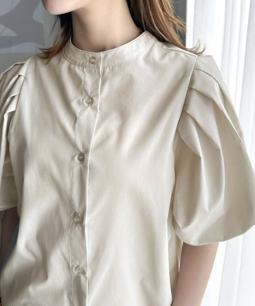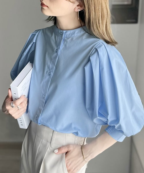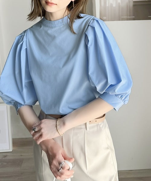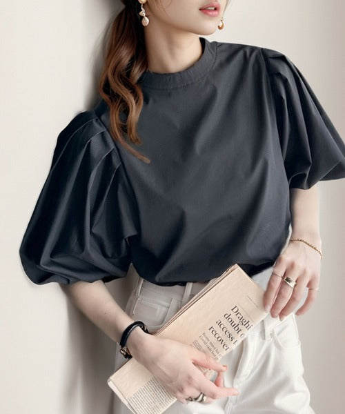 シンプルな印象ながらたっぷりタックの入った構築的なボリュームスリーブが可愛い1枚。