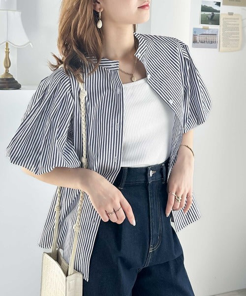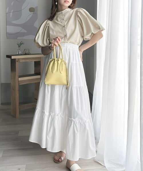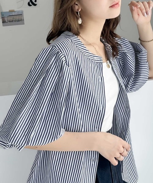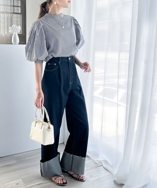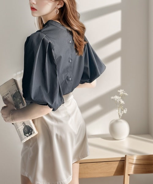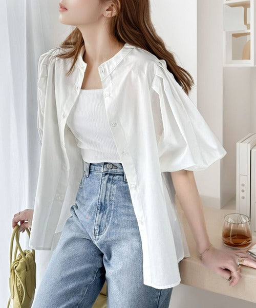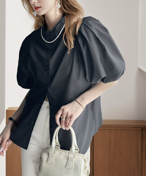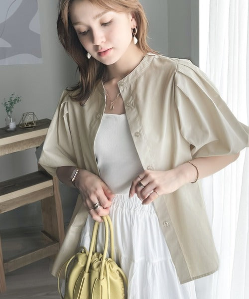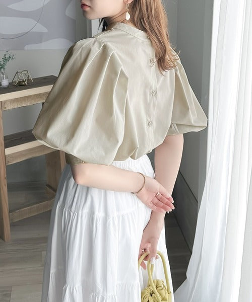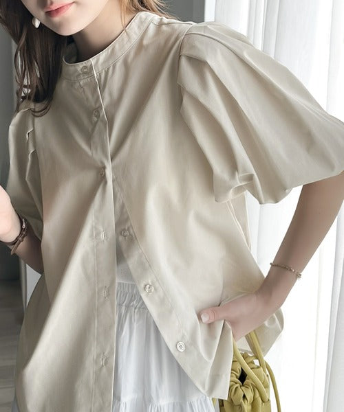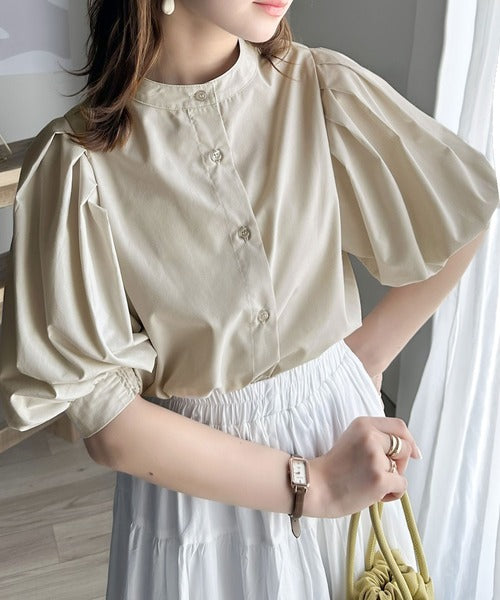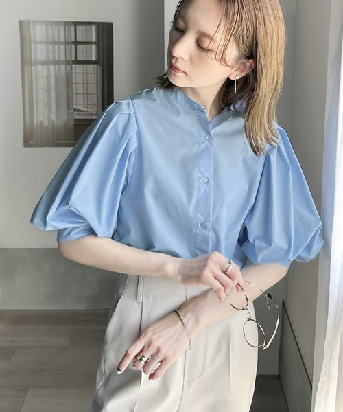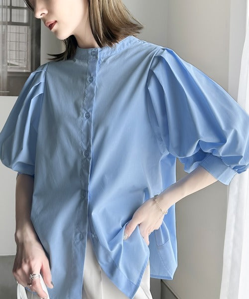 シンプルな印象ながらたっぷりタックの入った構築的なボリュームスリーブが可愛い1枚。