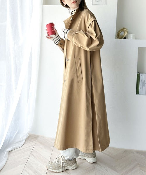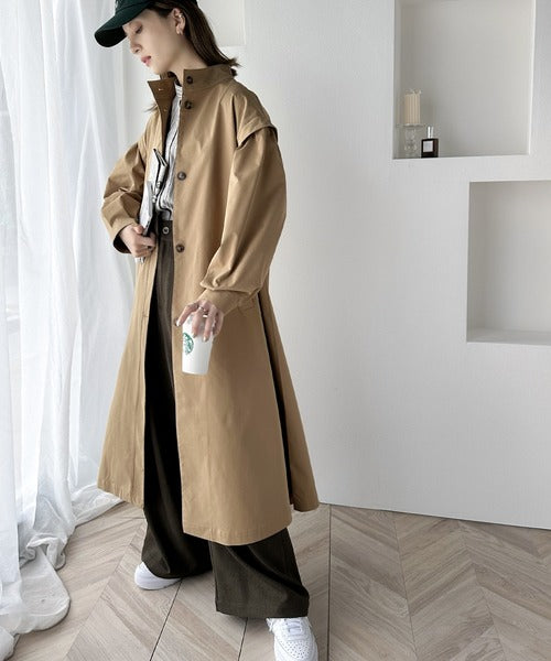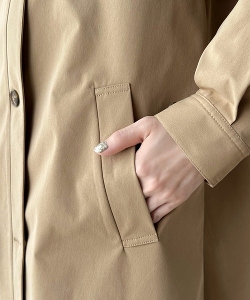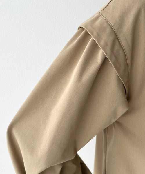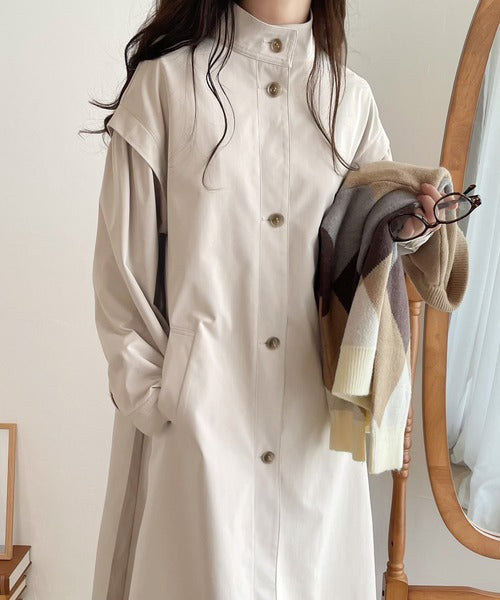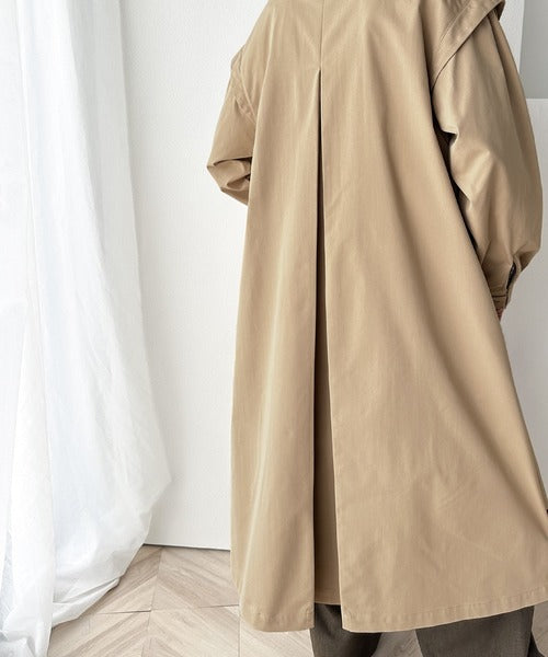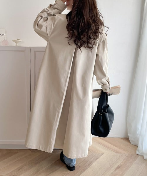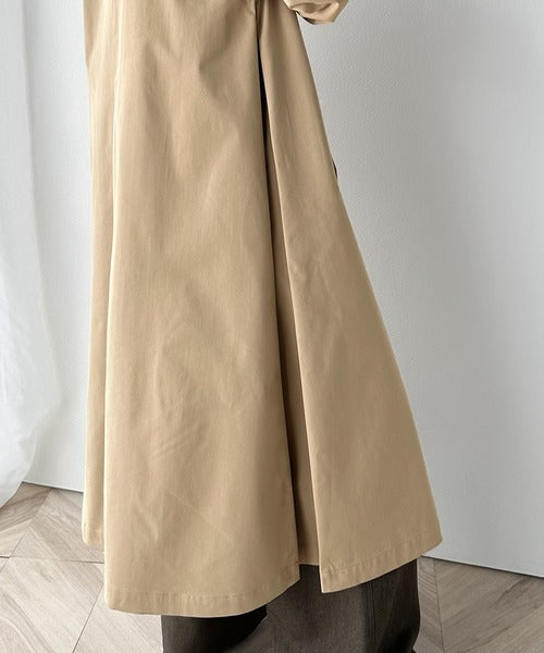 タックのデザインで着用により動きを楽しんで頂ける、ワンピース見えするロングコート。