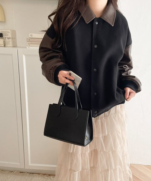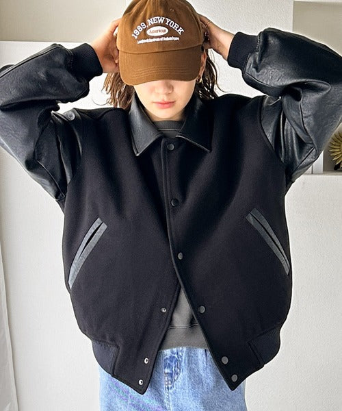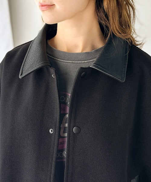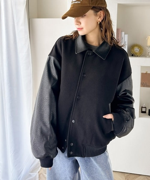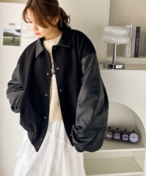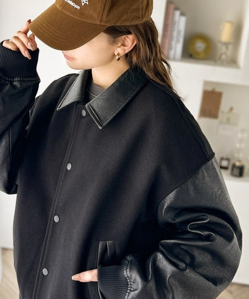 滑らかで厚みのあるメルトン生地に、フェイクレザーの袖をドッキングした旬のアウターが登場。
