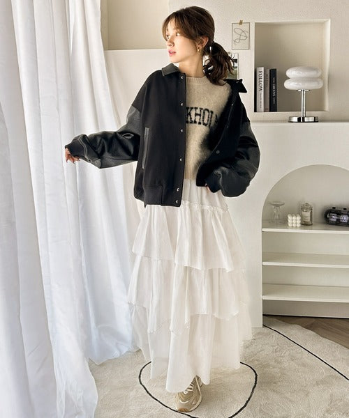 フェミニンなスカートを合わせていただくと甘辛コーデが完成。