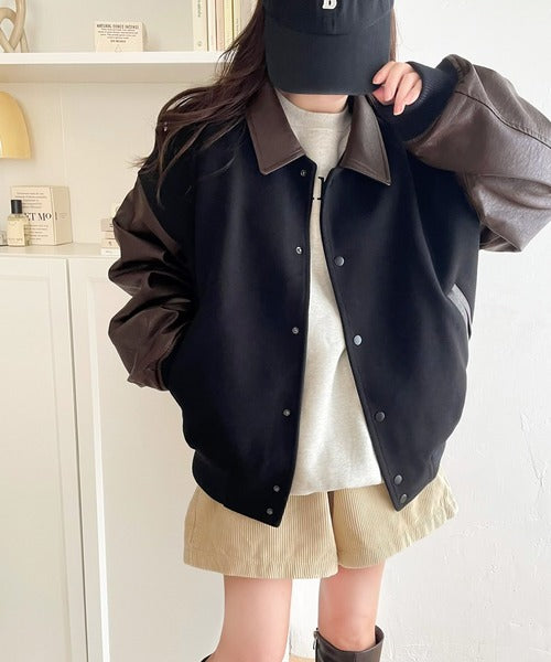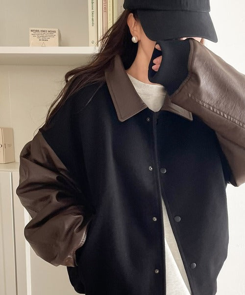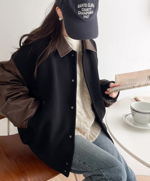 滑らかで厚みのあるメルトン生地に、フェイクレザーの袖をドッキング。