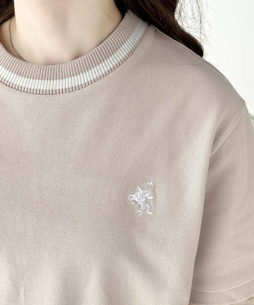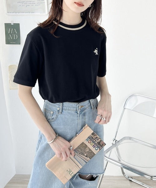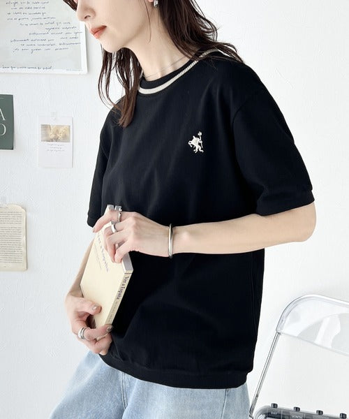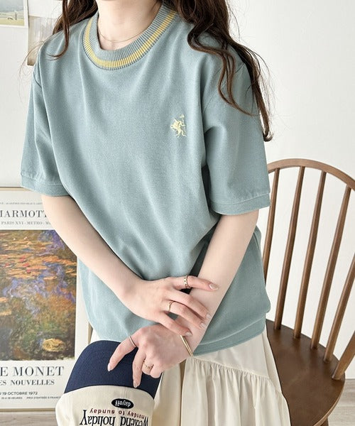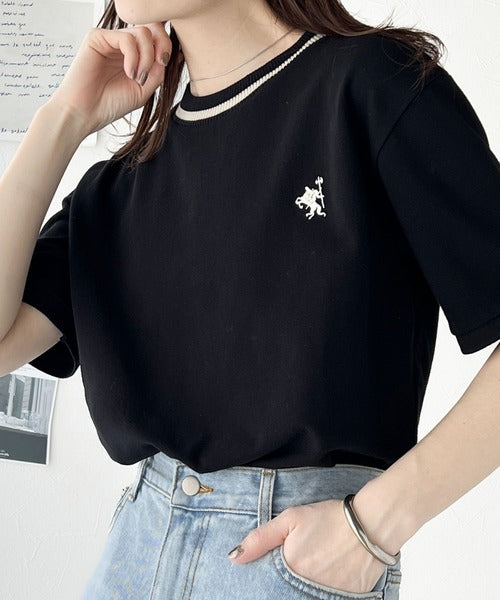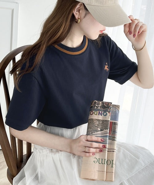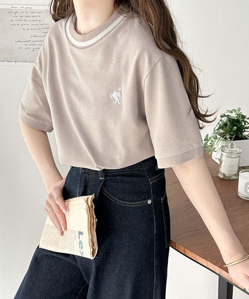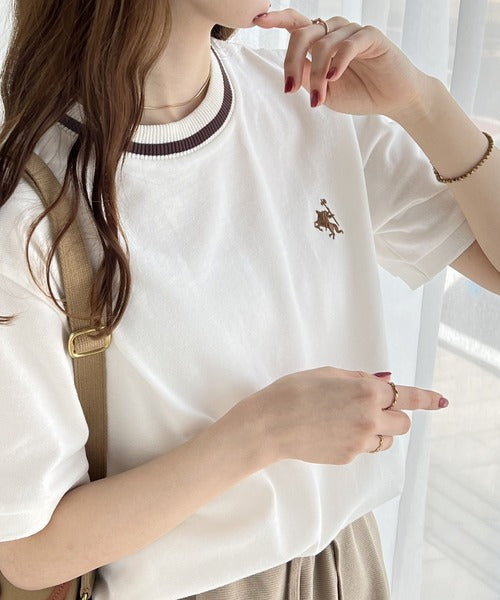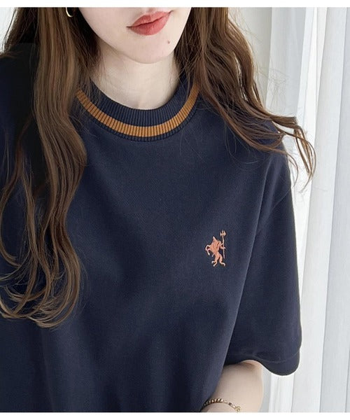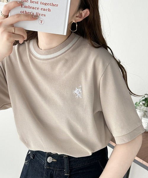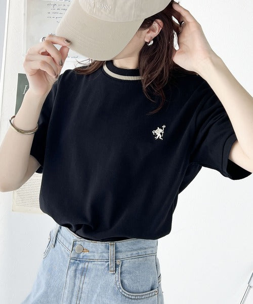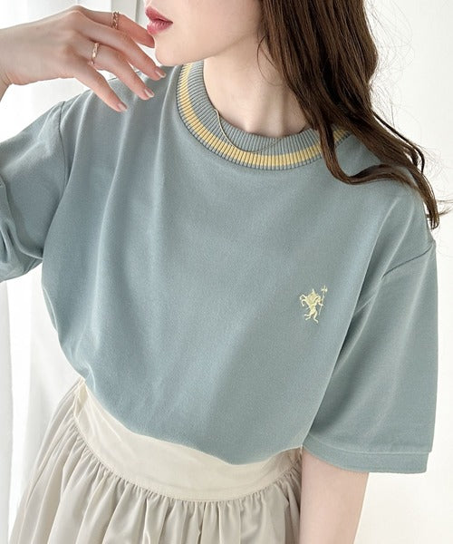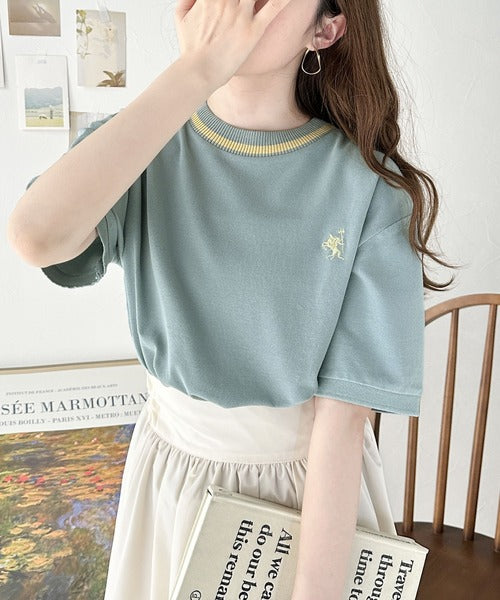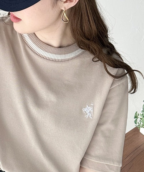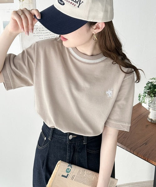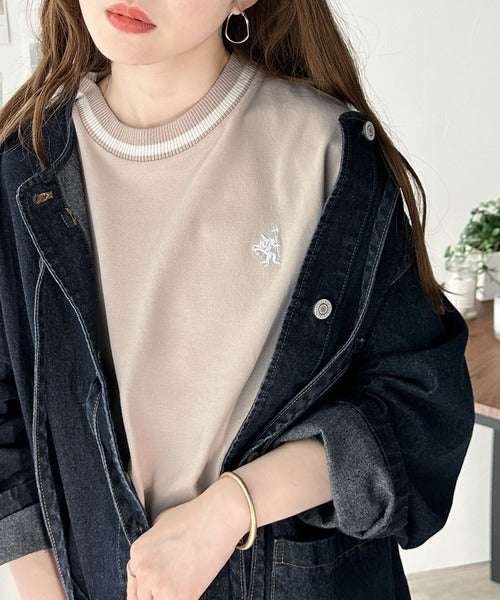 シンプルながらも、ワンポイント刺繍やレトロ感のある配色リブラインが印象的な一枚。