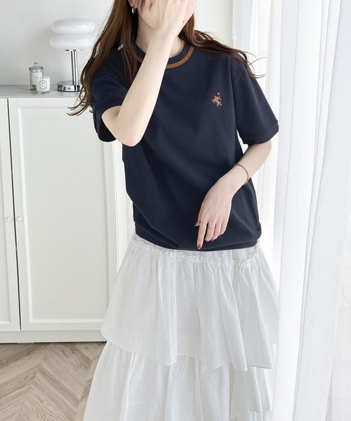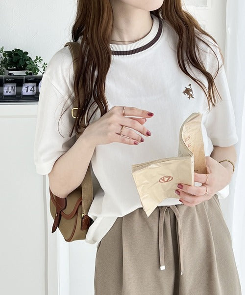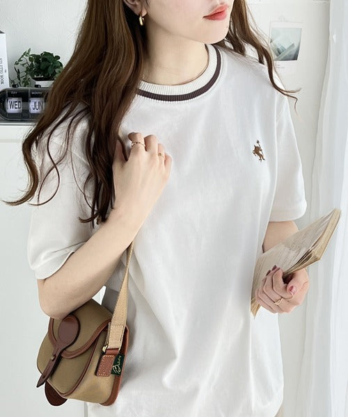 レトロ配色が可愛い。綿100%、編立リブワンポイント刺繍鹿の子Tシャツ ce1260165