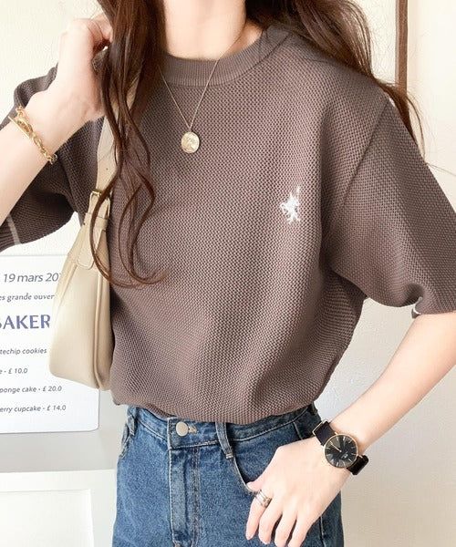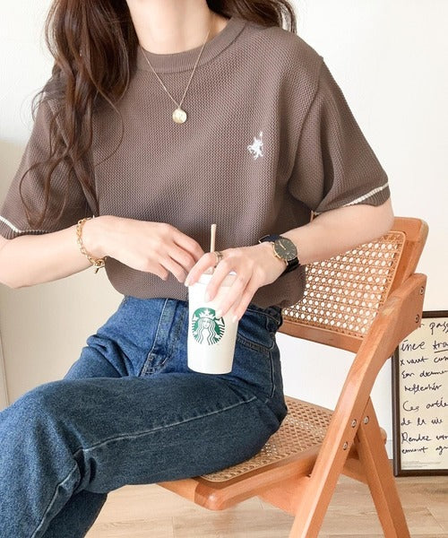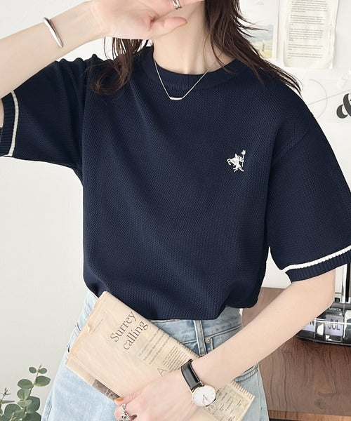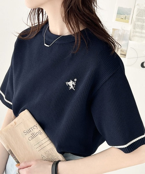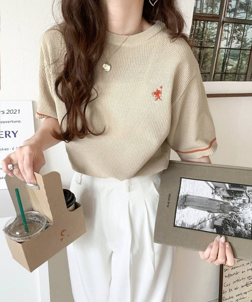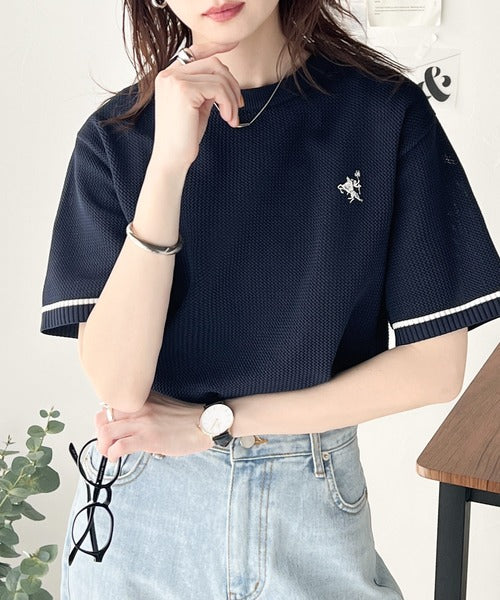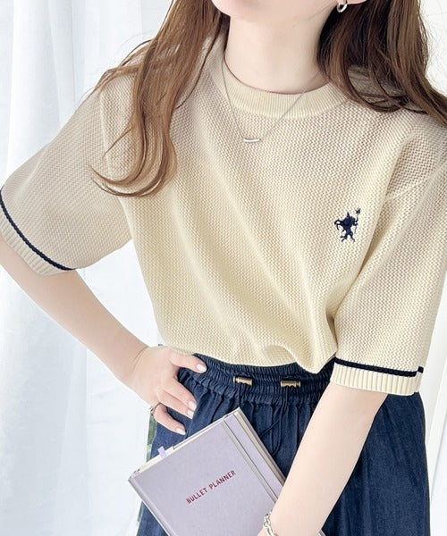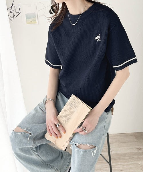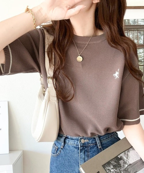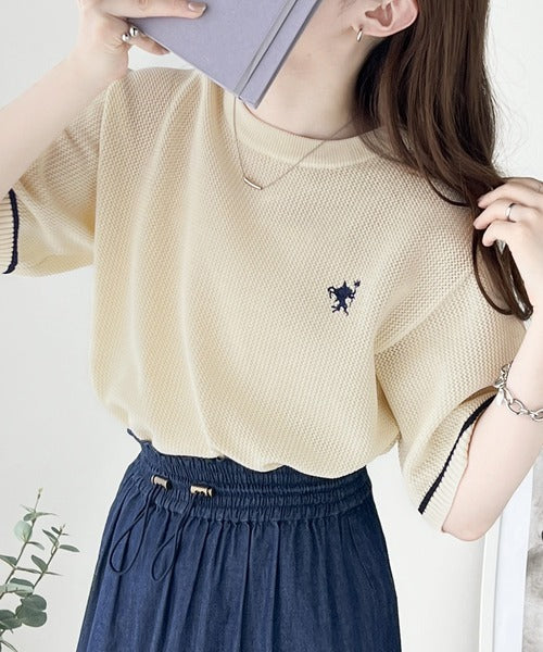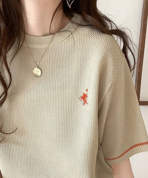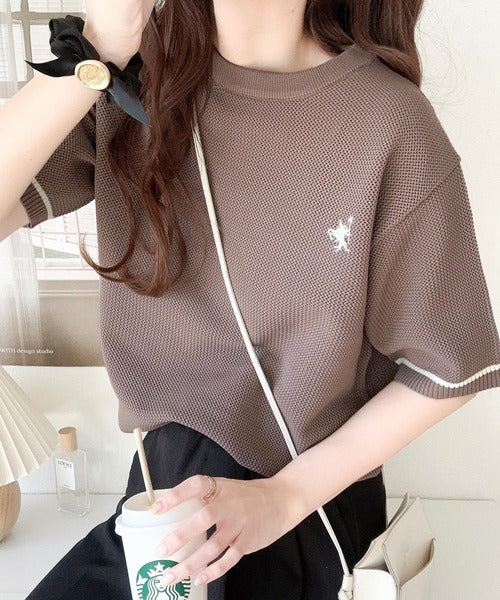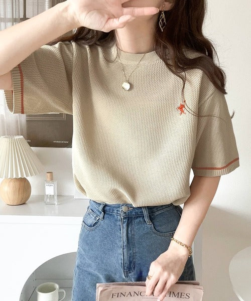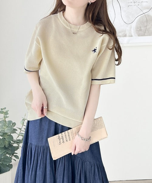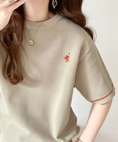 配色ラインと胸元の刺繍がポイントのメッシュ編みトップス。