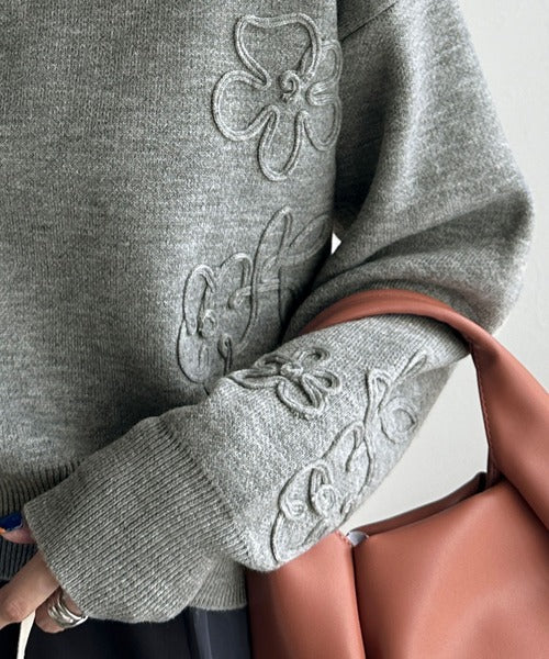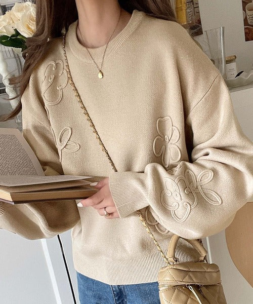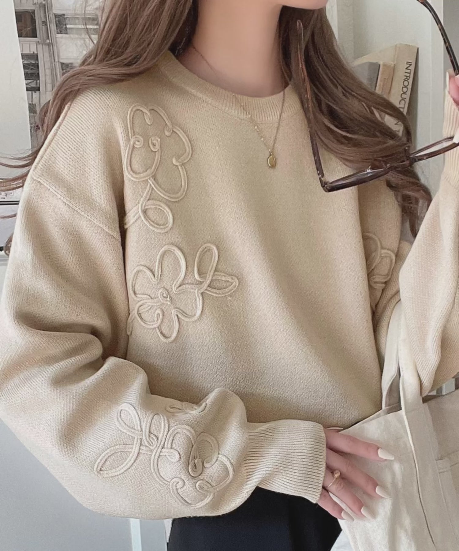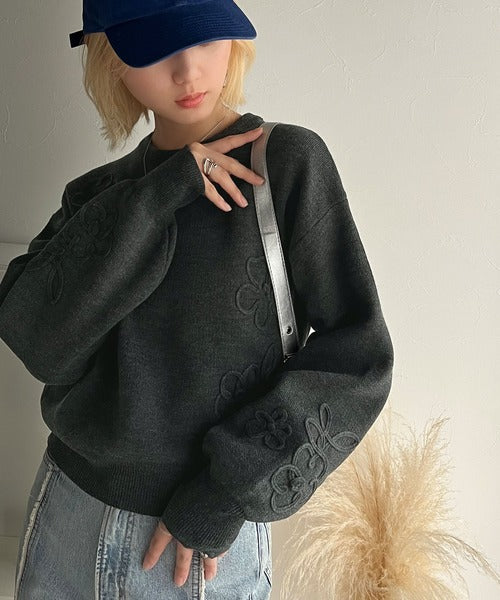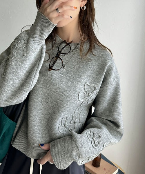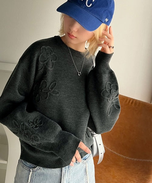 ぽわん袖が心をつかむ!コードフラワー使いクロップド丈ジャカードニット ce1260358