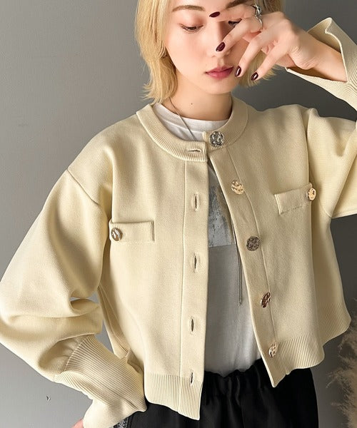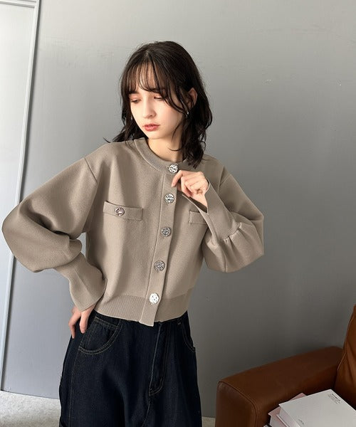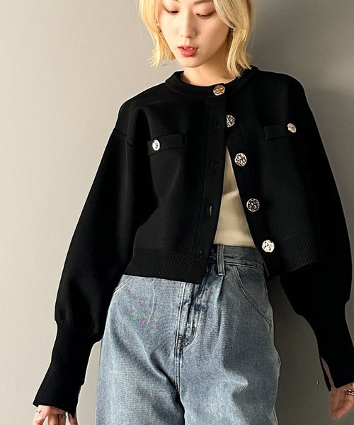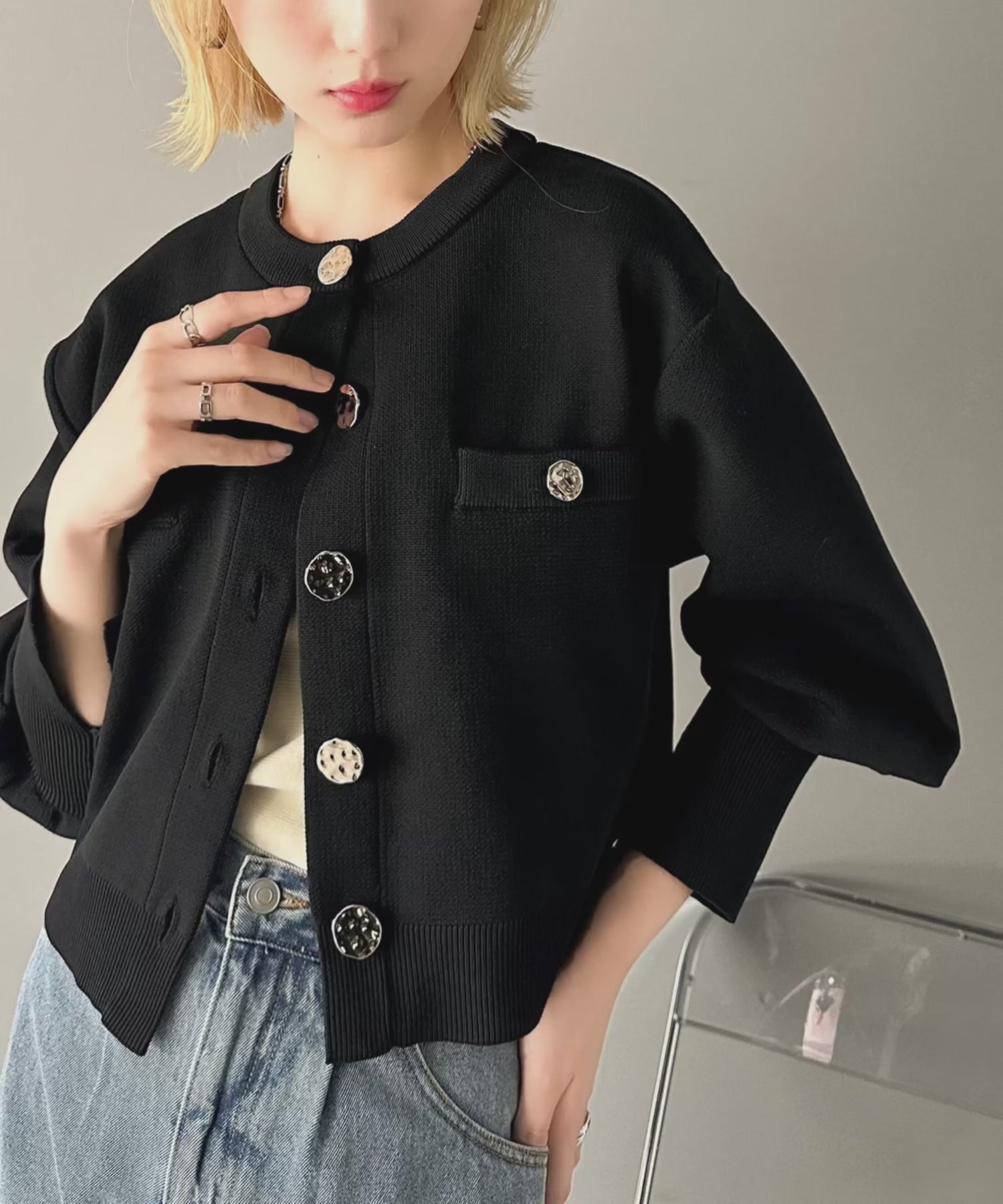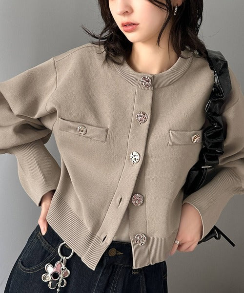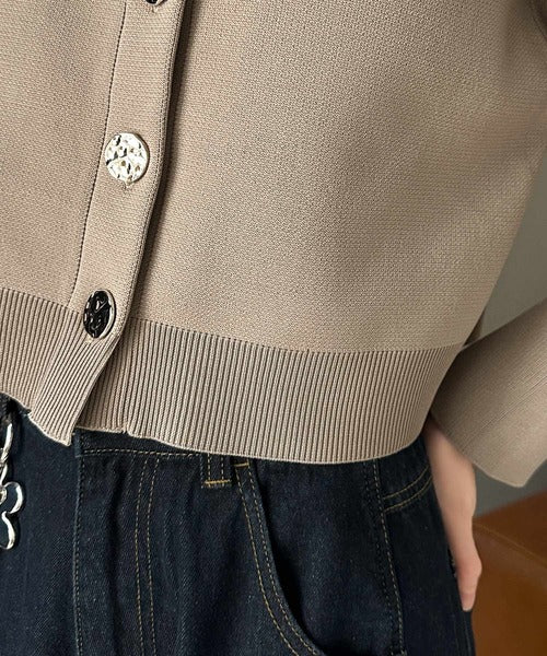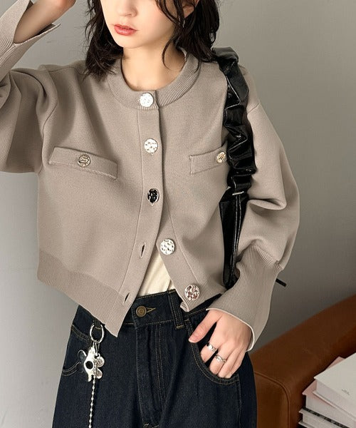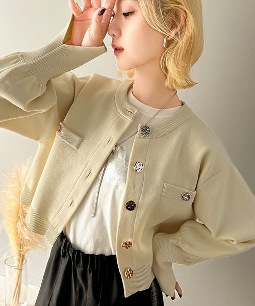 変型ボタンが華やかさをプラスする短丈ニットカーディガン。