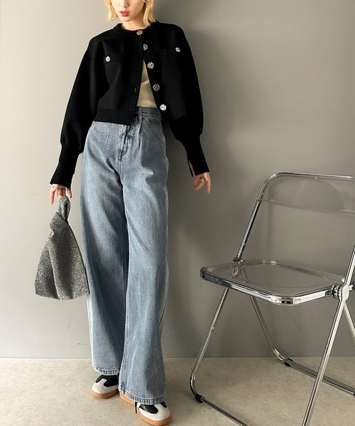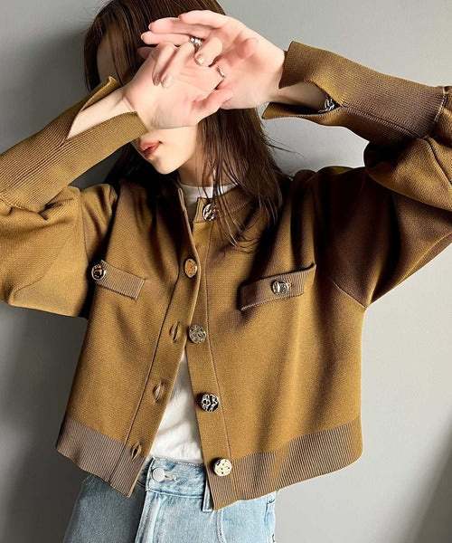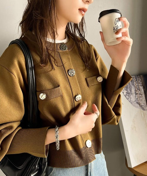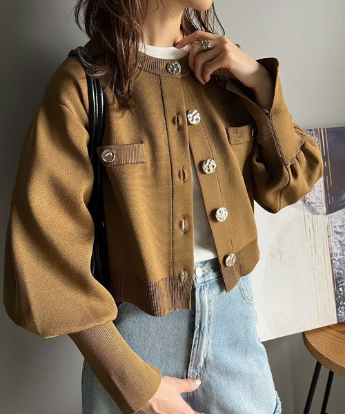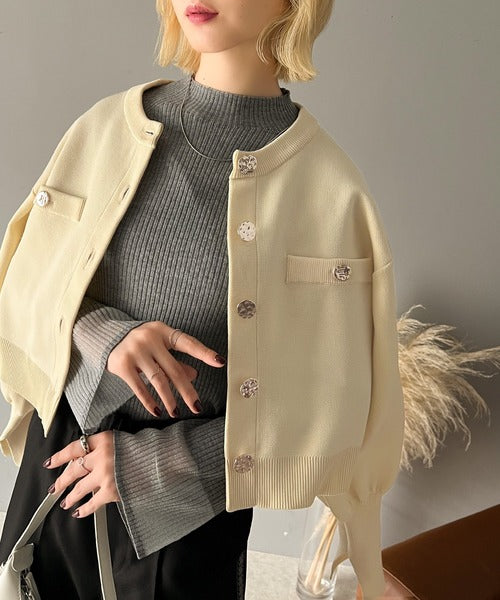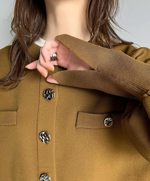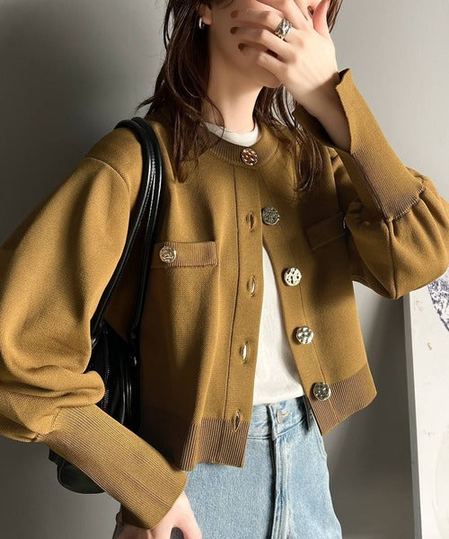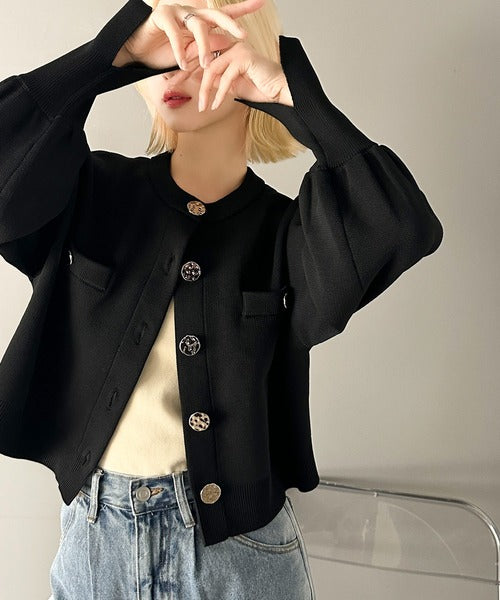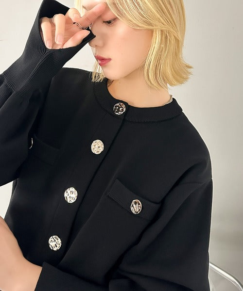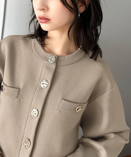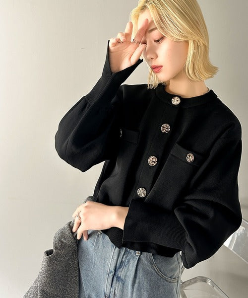 変型ボタンが華やかさをプラスする短丈ニットカーディガン。