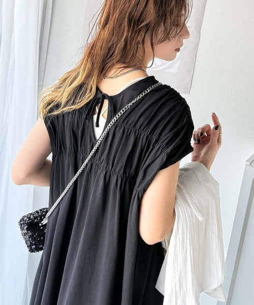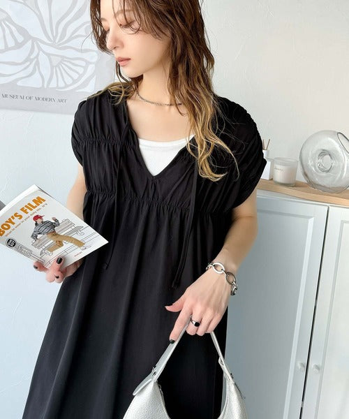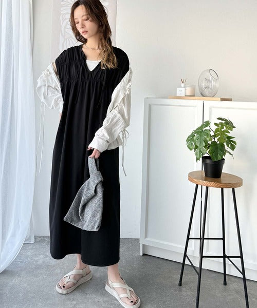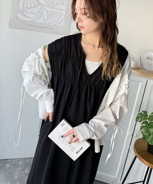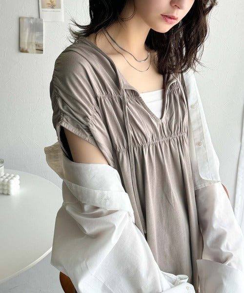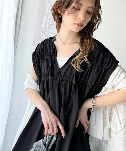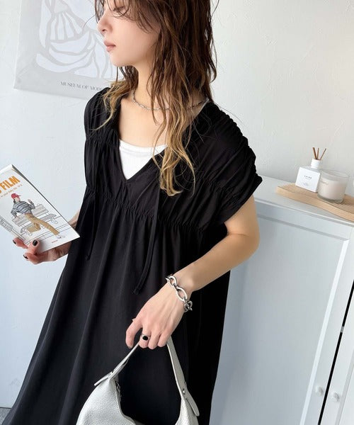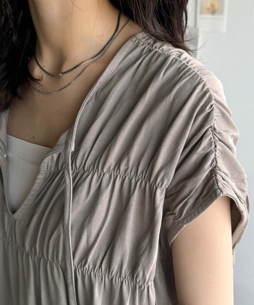 胸元と袖のシャーリングデザインでスタイルアップ効果抜群◎
