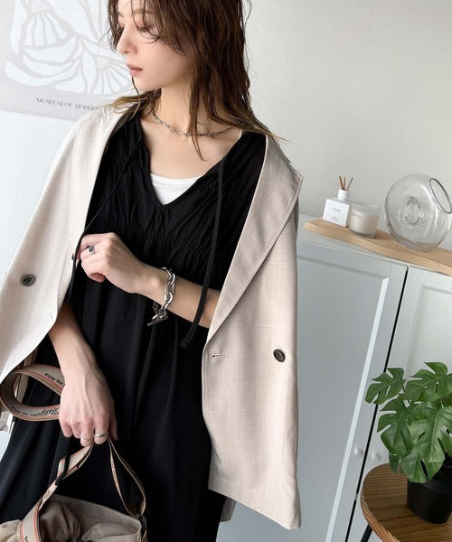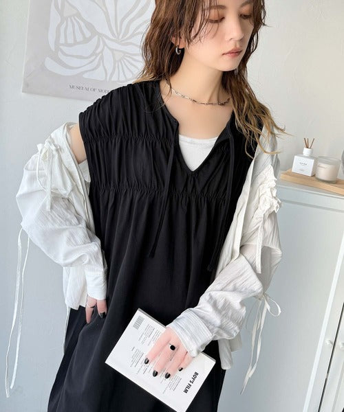 きれいめスタイルを楽しみたいときは、シアートップスやブラウスを合わせてジレを重ねるのがおすすめ。