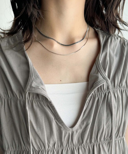 深めのキーネックで首周りをスッキリ見せてくれ、